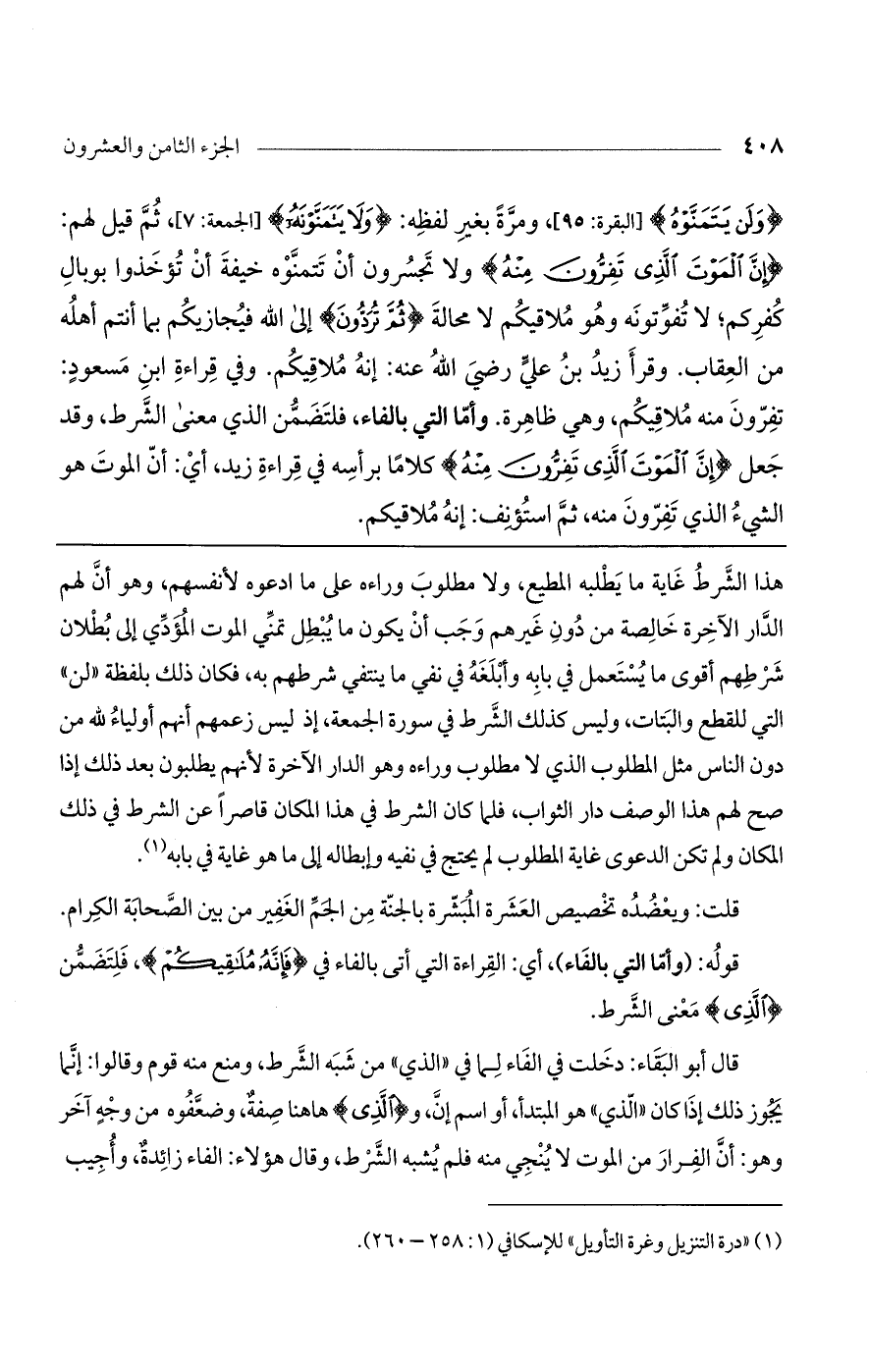 هذا الشرط غاية ما يطلبه المطيع، ولا مطلوب وراءه على ما ادعوه لأنفسهم، وهو أن لهم الدار الآخرة خالصة من دون غيرهم وجب أن يكون ما يبطل تمني الموت المؤدي إلى بطلان شرطهم أقوى ما يستعمل في بابه وأبلغه في نفي ما ينتفي شرطهم به، فكان ذلك بلفظة"لن" التي للقطع والبتات، وليس كذلك الشرط في سورة الجمعة، إذ ليس زعمهم أنهم أولياء لله من دون الناس مثل المطلوب الذي لا مطلوب وراءه وهو الدار الآخرة لأنهم يطلبون بعد ذلك إذا صح لهم هذا الوصف دار الثواب، فلما كان الشرط في هذا المكان قاصرًا عن الشرط في ذلك المكان ولم تكن الدعوى غاية المطلوب لم يحتج في نفيه وإبطاله إلى ما هو غاية في بابه.