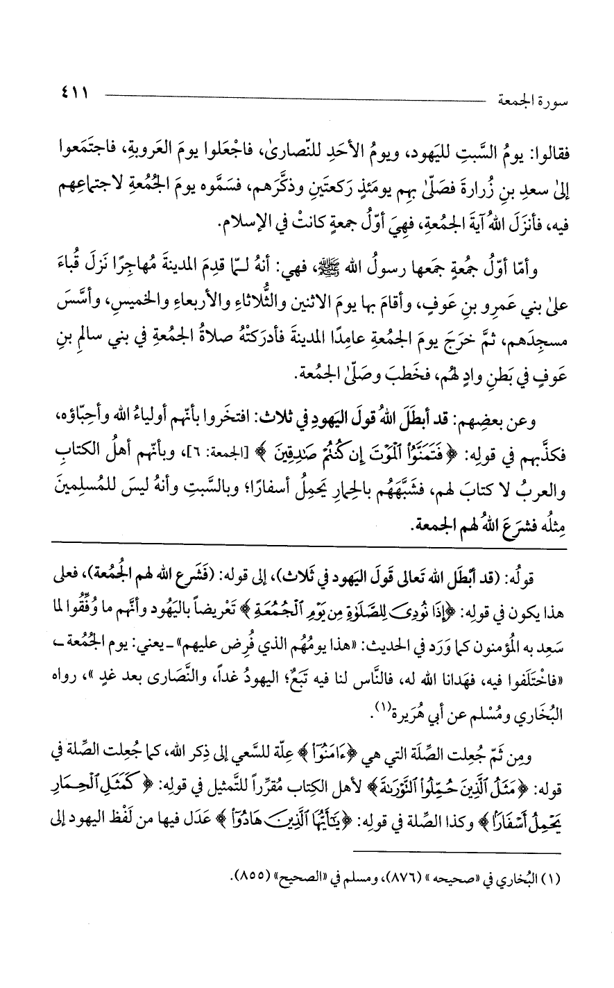 قوله: (قد أبطل الله تعالى قول اليهود في ثلاث)، إلى قوله: (فشرع الله لهم الجمعة)، فعلى هذا يكون في قوله: {إذَا نُودِيَ لِلصَّلاةِ مِن يَوْمِ الجُمُعَةِ} تعريضًا باليهود وأنهم ما وفقوا لما سعد به المؤمنون كما ورد في الحديث: "هذا يومهم الذي فرض عليهم"- يعني: يوم الجمعة-، "فاختلفوا فيه، فهدانا الله له، فالناس لنا فيه تبع؛ اليهود غدًا، والنصارى بعد غد"، رواه البخاري ومسلم عن أبي هريرة.