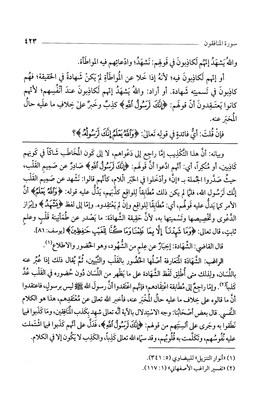 الراغب: الشهادة المتعارفة أصلها الحضور بالقلب والتبيين، ثم يقال ذلك إذا عبر عنه باللسان، ولذلك متى أطلق لفظ الشهادة على ما يظهر من اللسان دون حضوره في القلب عد كذبًا. وإما راجع إلى مطابقة اعتقادهم؛ فإنهم اعتقدوا أن رسول الله صلى الله عليه وسلم ليس برسول، فاعتقدوا أن ما قالوه على خلاف ما عليه حال المخبر عنه، فأخبر الله تعالى عن معتقدهم، هذا هو الكلام النفسي. قال بعض أصحابنا: وجه الاستدلال بالآية أنه تعالى شهد بكذب المنافقين، وما كذبوا فيما نطقوا به وجرى على ألسنتهم من قولهم: {إنَّكَ لَرَسُولُ اللَّهِ}، فدل على أنهم كذبوا فيما اشتملت عليه نفوسهم، وتكلمت به قلوبهم، وقد سماه الله تعالى كذبًا، والكذب لا يكون إلا في الكلام.