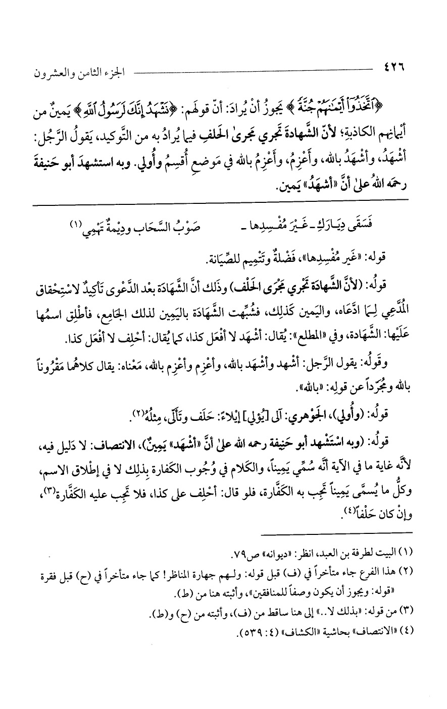 قوله: (وبه استشهد أبو حنيفة رحمه الله على أن"أشهد" يمين)، الانتصاف: لا دليل فيه، لأنه غاية ما في الآية أنه سمي يمينًا، والكلام في وجوب الكفارة بذلك لا في إطلاق الاسم، وكل ما يسمى يمينًا تجب به الكفارة، فلو قال: أحلف على كذا، فلا تجب عليه الكفارة، وإن كان حلفًا.
