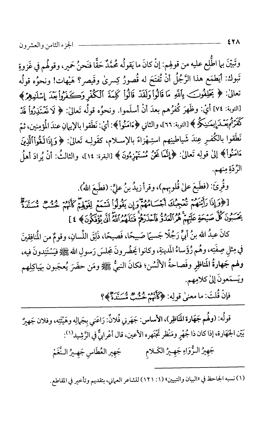 كان عبد الله بن أبي رجلا جسيما صبيحًا، ذلق اللسان، وقوم من المنافقين في مثل صفته، وهم رؤساء المدينة، وكانوا يحضرون مجلس رسول الله صلى الله عليه وسلم ومن حضر يعجبون بهياكلهم ويسمعون إلى كلامهم.