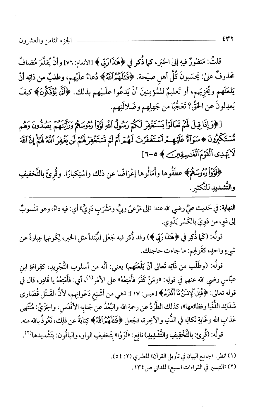 قوله: (قرئ: بالتخفيف والتشديد) نافع: "لووا" بتخفيف الواو، والباقون: بتشديدها.