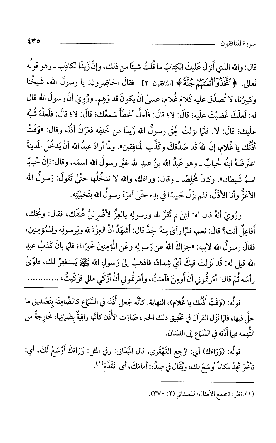 قال: والله الذي أنزل عليك الكتاب ما قلت شيئًا من ذلك، وإن زيدًا لكاذب- وهو قوله تعالى: {اتَّخَذُوا أَيْمَانَهُمْ جُنَّةً} [المنافقون: 2]_ فقال الحاضرون: يا رسول الله، شيخنا وكبيرنا، لا تصدق عليه كلام غلام، عسى أن يكون قد وهم. وروي أن رسول الله قال له: لعلك غضبت عليه؛ قال: لا؛ قال: فلعله أخطأ سمعك؛ قال: لا؛ قال: فلعله شبه عليك؛ قال: لا. فلما نزلت لحق رسول الله زيدًا من خلفه فعرك أذنه وقال: " وفت أذنك يا غلام، إن الله قد صدقك وكذب المنافقين". ولما أراد عبد الله أن يدخل المدينة اعترضه ابنه حباب_ وهو عبد الله بن عبد الله غير رسول الله اسمه، وقال: " إن حبابًا اسم شيطان". وكان مخلطًا_ وقال: وراءك، والله لا تدخلها حتى تقول: رسول الله الأعز وأنا الأذل، فلم يزل حبيسًا في يده حتى أمره رسول الله بتخليته.