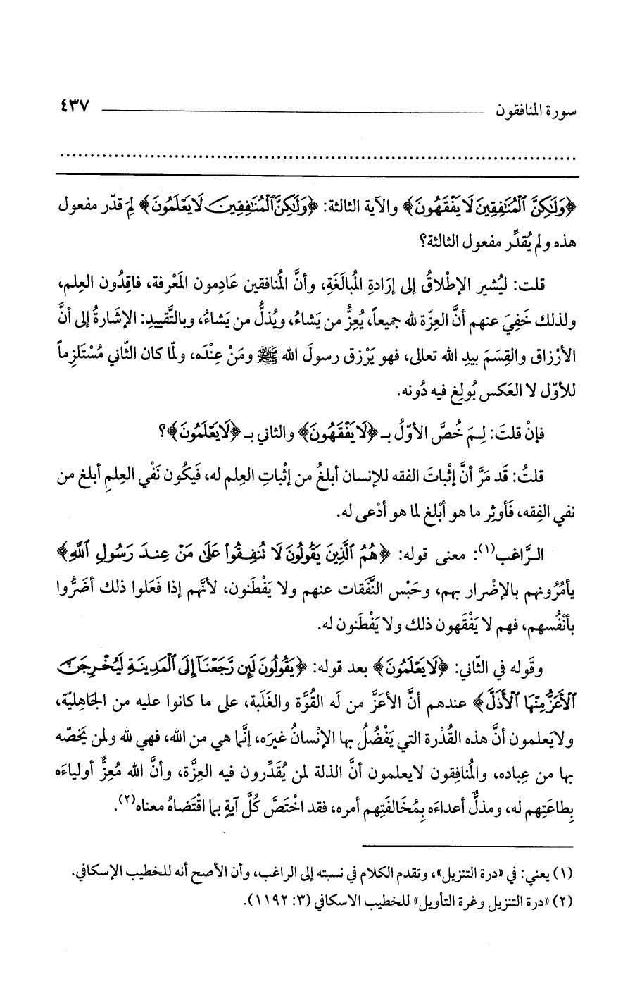{ولَكِنَّ المُنَافِقِينَ لا يَفْقَهُونَ} والآية الثالثة: {ولَكِنَّ المُنَافِقِينَ لا يَعْلَمُونَ} لم قدر مفعول هذه ولم يقدر مفعول الثالثة؟