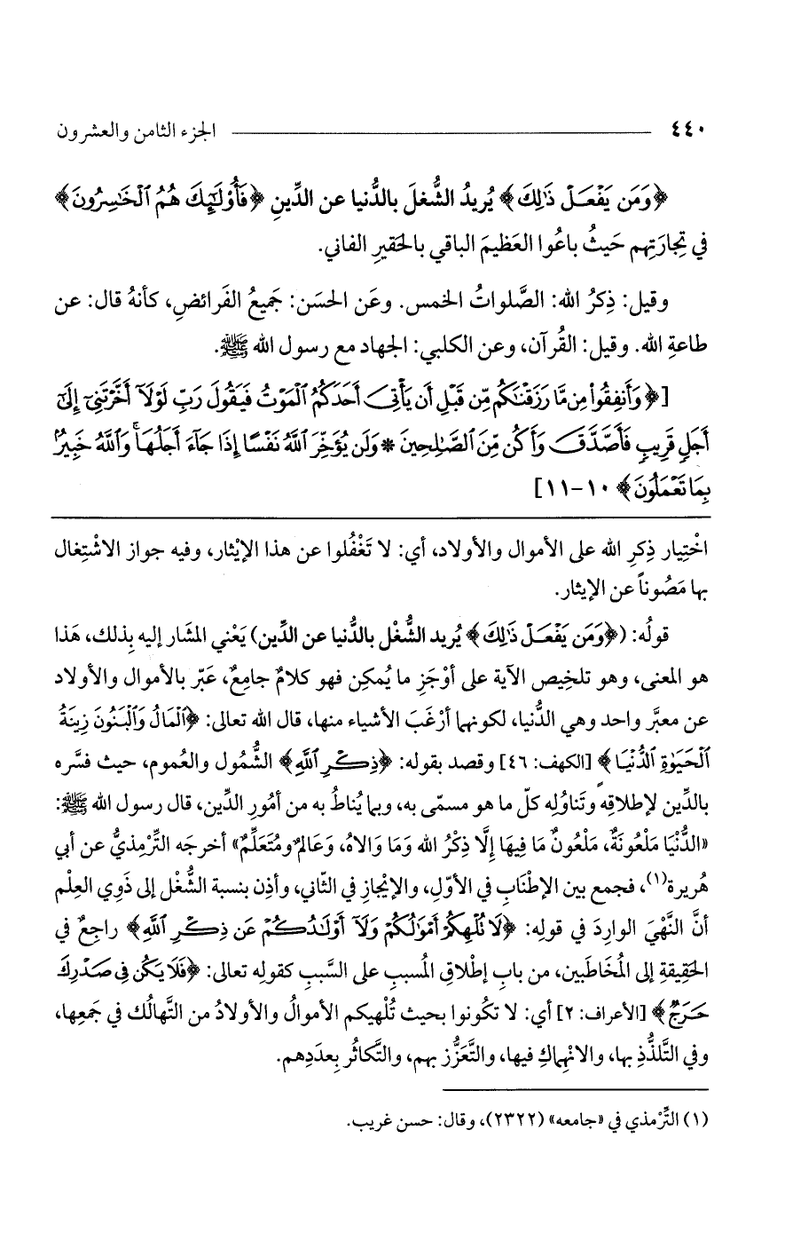قوله: ({ومَن يَفْعَلْ ذَلِكَ} يريد الشغل بالدنيا عن الدنيا) يعني المشار إليه بذلك، هذا هو المعنى، وهو تلخيص الآية على أوجز ما يمكن فهو كلام جامع، عبر بالأموال والأموال والأولاد عن معبر واحد وهي الدنيا، لكونهما أرغب الأشياء منها، قال الله تعالى: {الْمَالُ وَالْبَنُونَ زِينَةُ الْحَيَاةِ الدُّنْيَا} [الكهف: 46] وقصد بقوله: {ذِكْرِ اللَّهِ} الشمول والعموم، حيث فسره بالدين لإطلاقه وتناوله كل ما هو مسمي به، وبما يناط به من أمور الدين، قال رسول الله: "الدنيا ملعونة، ملعون ما فيها إلا ذكر الله وما والاه، وعالم ومتعلم" أخرجه الترمذي عن أبي هريرة، فجمع بين الإطناب في الأول، والإيجاز في الثاني، وأذن بنسبة الشغل إلى ذوي العلم أن النهي الوارد في قوله: {لا تُلْهِكُمْ أَمْوَالُكُمْ ولا أَوْلادُكُمْ عَن ذِكْرِ اللَّهِ} راجع في الحقيقة إلى المخاطبين، من باب إطلاق المسبب على السبب كقوله تعالى: {فَلَا يَكُنْ فِي صَدْرِكَ حَرَجٌ} [الأعراف: 2] أي: لا تكونوا بحيث تلهيكم الأموال والأولاد من التهالك في جمعها، وفي التلذذ بها، والانهماك فيها، والتعزز بهم، والتكاثر بعددهم.