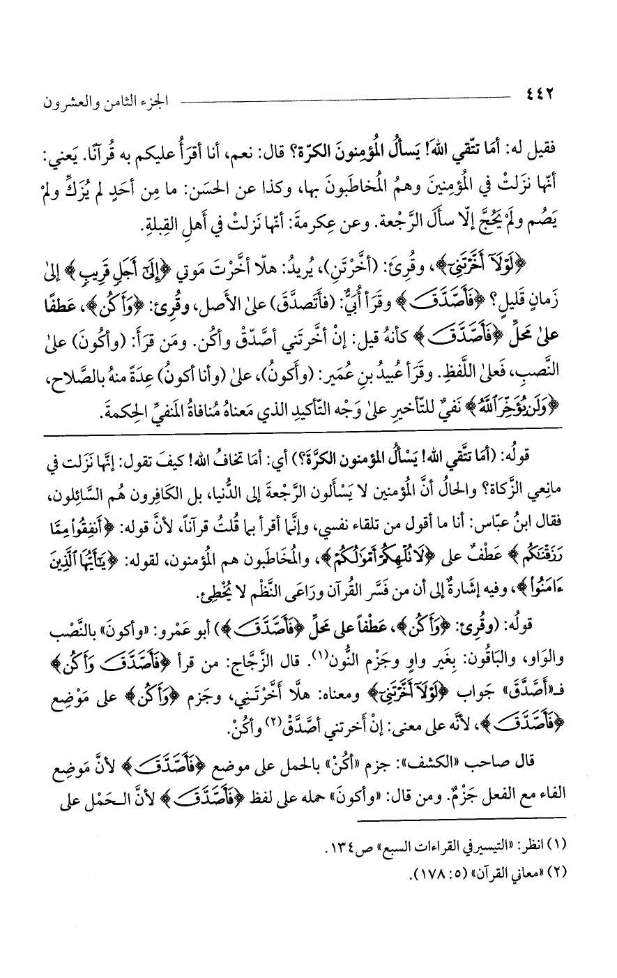 قوله: (وقرئ: {وَأَكُن}، عطفًا على محل {فَأَصَّدَّقَ}) أبو عمرو: "وأكون" بالنصب والواو، والباقون: بغير واو وجزم النون. قال الزجاج: من قرأ {فَأَصَّدَّقَ وأَكُن} فـ"أصدق" جواب {لَوْلا أَخَّرْتَنِي} معناه: هلا أخرتني، وجزم {وأَكُن} على موضع {فَأَصَّدَّقَ}، لأنه على معنى: إن أخرتني أصدق وأكن. قال صاحب "الكشف": جزم "أكن" بالحمل على موضع {فَأَصَّدَّقَ} لأن موضع الفاء مع الفعل جزم. ومن قال: "وأكون" حمله على لفظ {فَأَصَّدَّقَ} لأن الحمل على