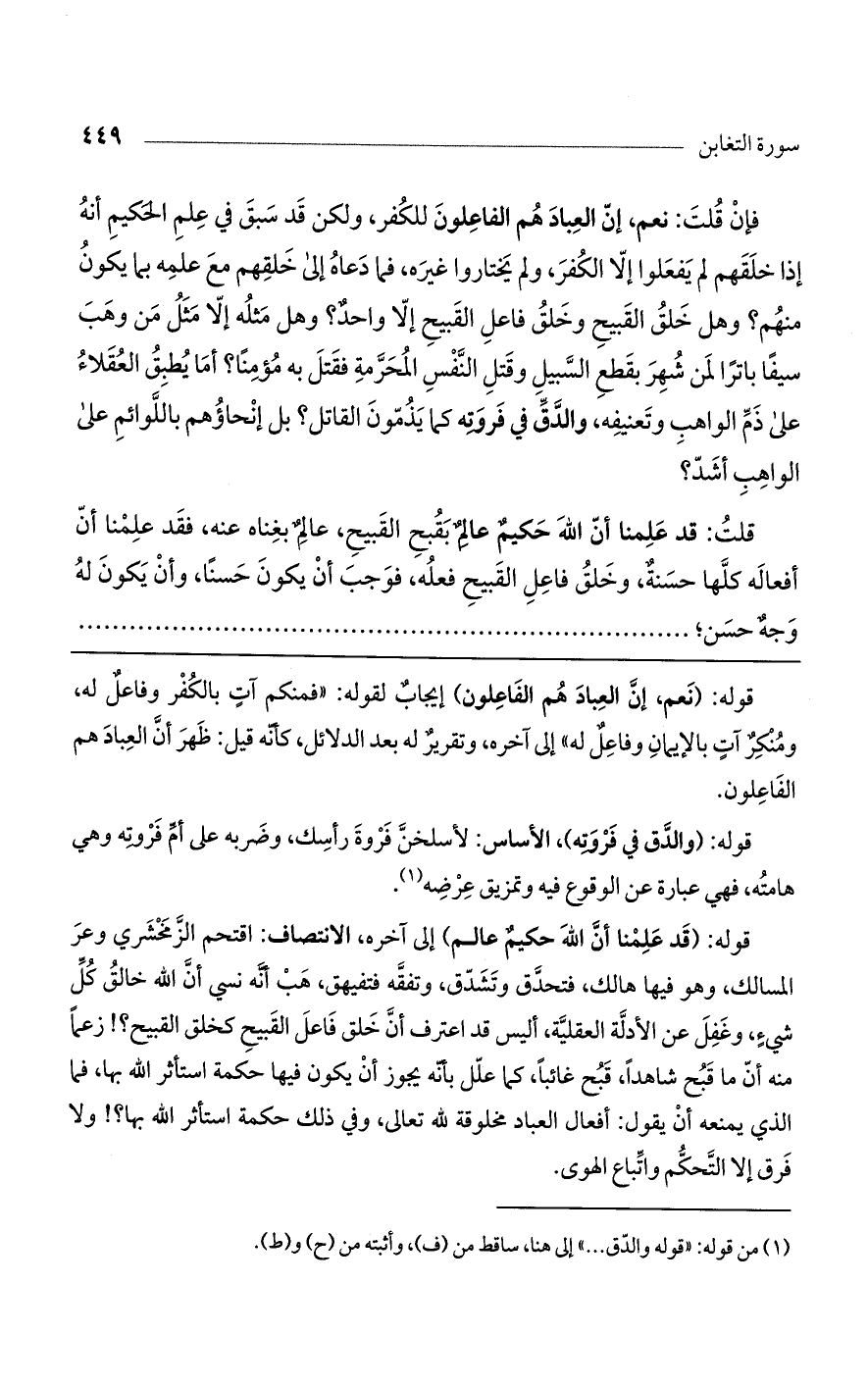 فإن قلت: نعم، إن العباد هم الفاعلون للكفر، ولكن قد سبق في علم الحكيم أنه إذا خلقهم لم يفعلوا إلا الكفر، ولم يختاروا غيره، فما دعاه إلى خلقهم مع علمه بما يكون منهم؟ وهل خلق القبيح وخلق فاعل القبيح إلا واحد؟ وهل مثله إلا مثل من وهب سيفًا باترًا لمن شهر بقطع السبيل وقتل النفس المحرمة فقتل به مؤمنًا؟ أما يطبق العقلاء على ذم الواهب وتعنيفه، والدق في فروته كما يذمون القاتل؟ بل إنحاؤهم باللوائم على الواهب أشد؟