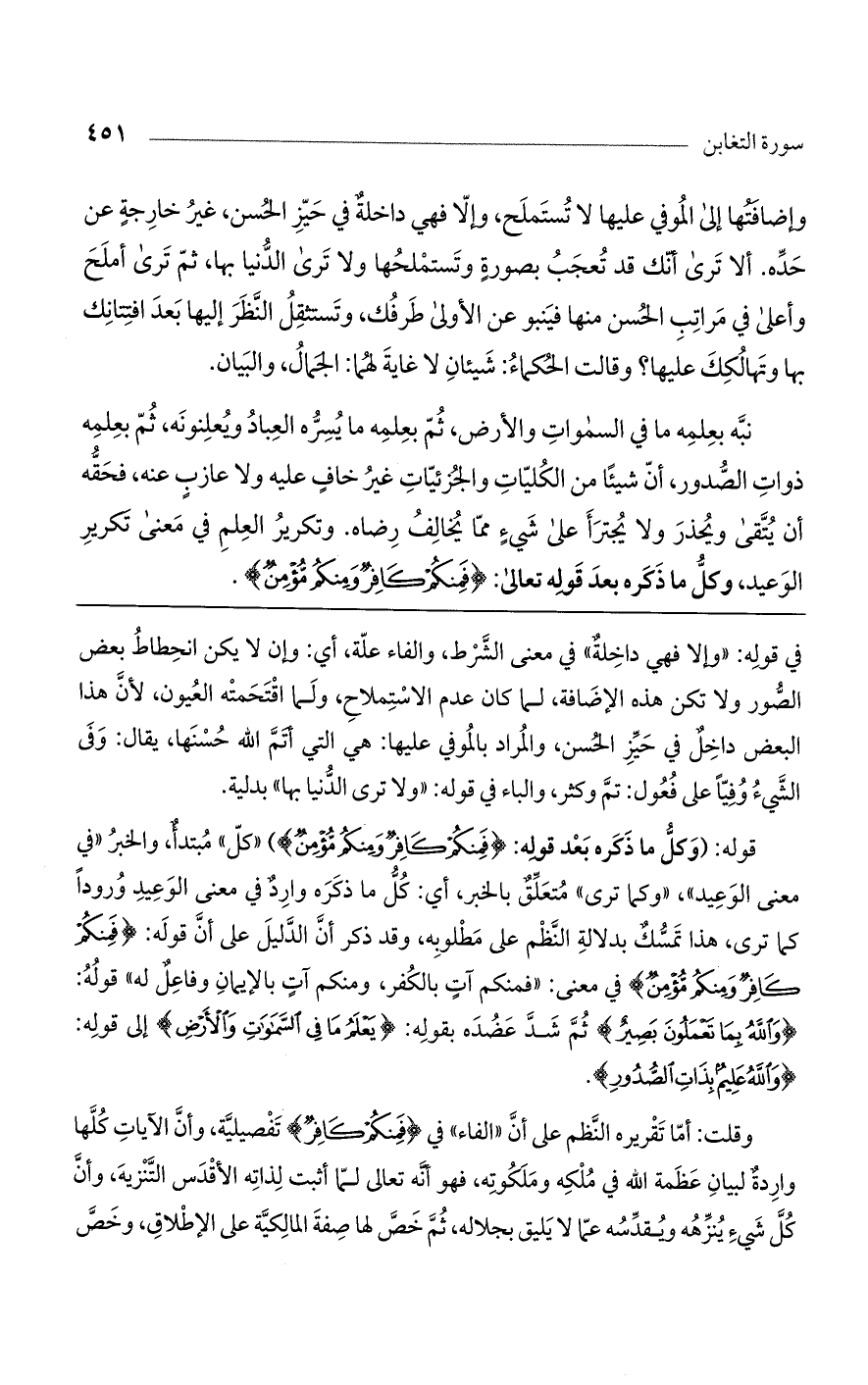 وقلت: أما تقريره النظم على أن "الفاء" في {فَمِنكُمْ كَافِرٌ} تفصيلية، وأن الآيات كلها واردة لبيان عظمة الله في ملكه وملكوته، فهو أنه تعالى لما أثبت لذاته الأقدس التنزيه، وأن كل شيء ينزهه ويقدسه عما لا يليق بجلاله، ثم خص لها صفة المالكية على الإطلاق، وخص