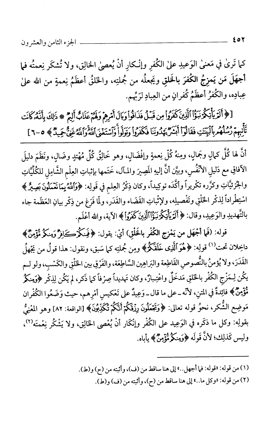 قوله: (فما أجهل من يمزج الكفر بالخلق) أي: يقول: {فَمِنكُمْ كَافِرٌ وَمِنكُم مُّؤْمِنٌ} دخلان تحت قوله: {هُوَ الَّذِي خَلَقَكُمْ} ومن جملته كما سبق، ونقول: هذا قول من يجهل القدر، ولا يؤمن بالنصوص القاطعة والبراهين الساطعة، والفرق بين الخلق والكسب، ولو لم يكن لمزج الكفر بالخلق مدخل واعتبار، وكان تهديدًا صرفًا كما ذكر، لم يكن لذكر {وَمِنكُم مُّؤْمِنٌ} فائدة في المتن، لأنه- على ما قال- وعيد على تعكيس أمرهم، حيث وضعوا الكفران موضع الشكر، نحو قوله تعالى: {وَتَجْعَلُونَ رِزْقَكُمْ أَنَّكُمْ تُكَذِّبُونَ} [الواقعة: 82] وهو المعني بقوله: وكل ما ذكره في الوعيد على الكفر وإنكار أن يعصى الخالق، ولا يشكر نعمته، وليس كذلك؛ لأن قوله {وَمِنكُم مُّؤْمِنٌ} يأباه.