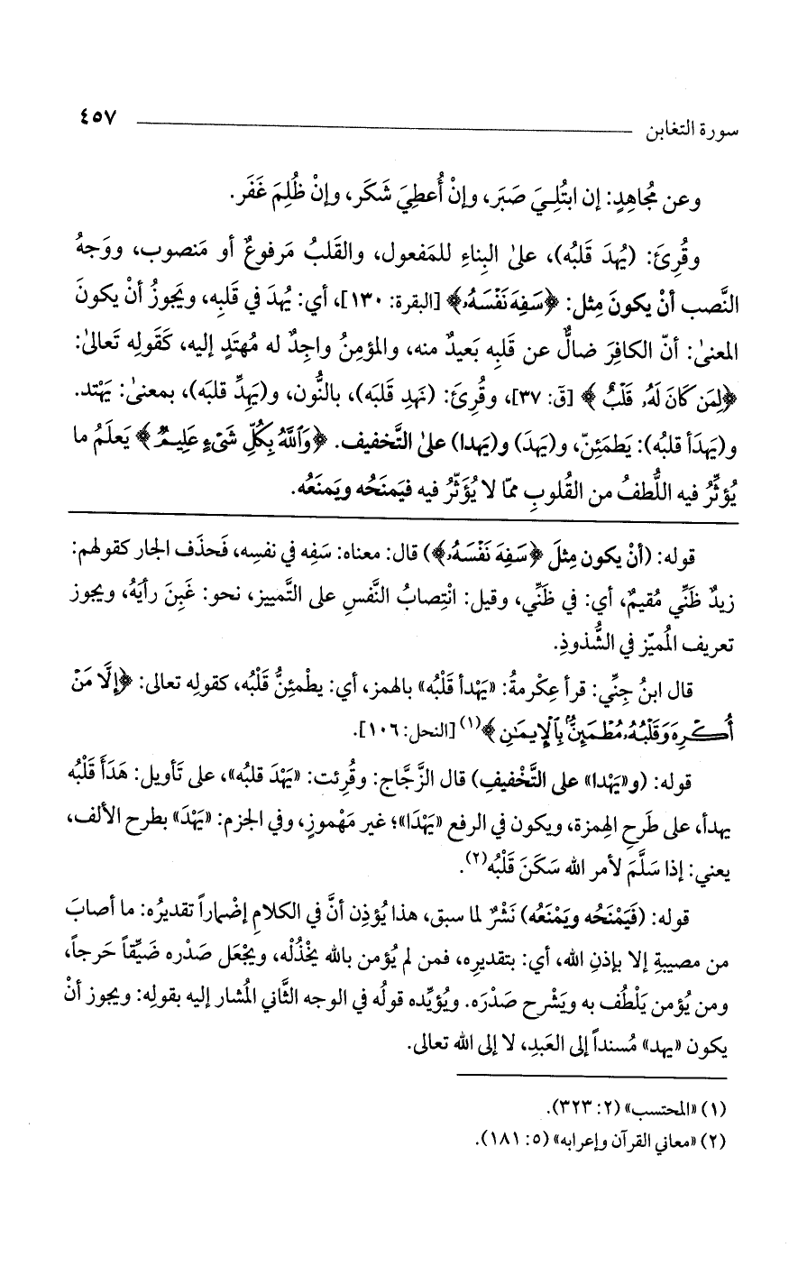 قوله: (و"يهدا" على التخفيف) قال الزجاج: وقرئت: "يهد قلبه"، على تأويل: هدأ قلبه يهدأ، على طرح الهمزة، ويكون في الرفع"يهدا"؛ غير مهموز، وفي الجزم: "يهد" بطرح الألف، يعني: إذا سلم لأمر الله سكن قلبه.