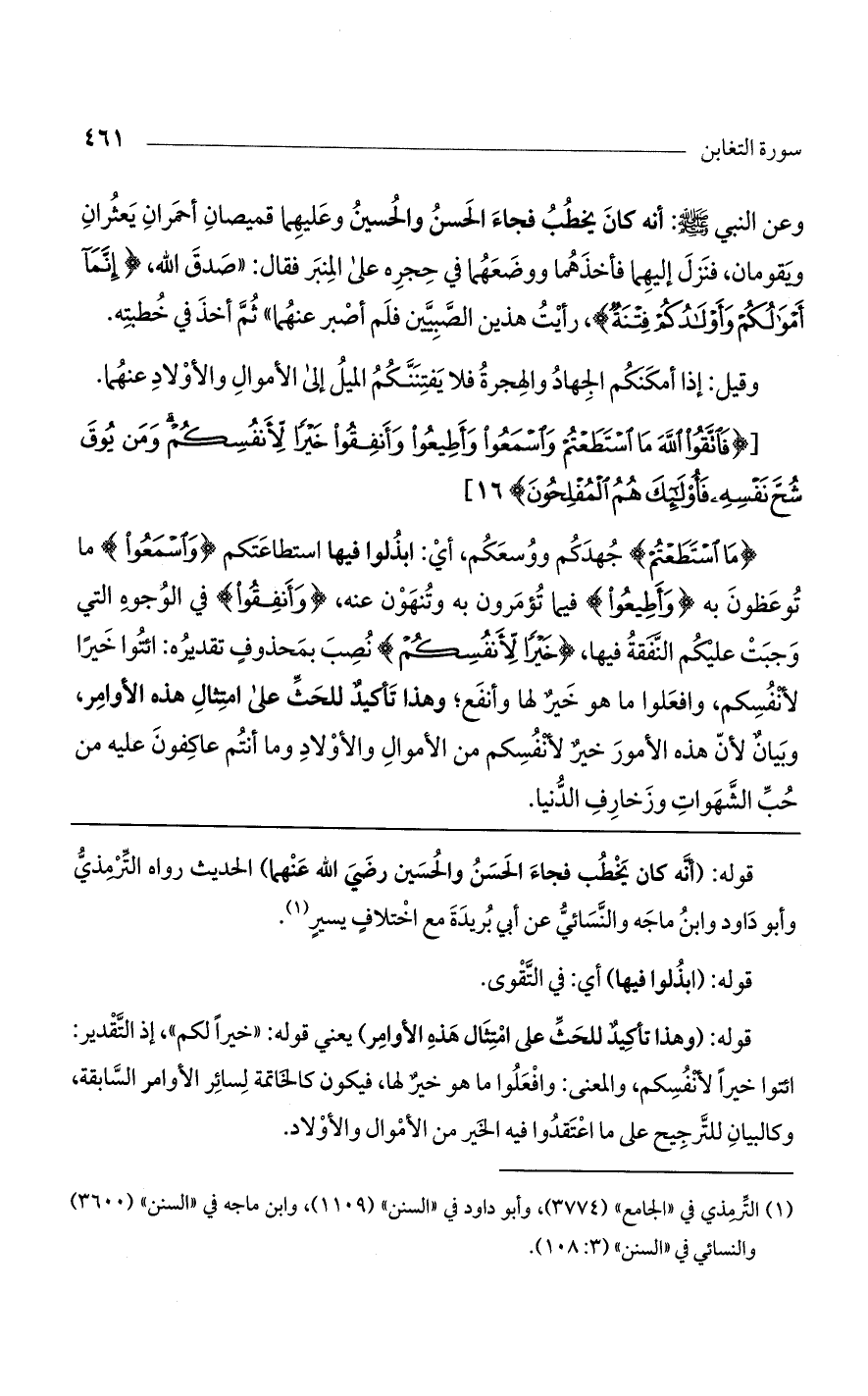 وعن النبي صلى الله عليه وسلم: أنه كان يخطب فجاء الحسن والحسين وعليهما قميصان أحمران يعثران ويقومان، فنزل إليهما فأخذهما ووضعهما في حجره على المنبر فقال: " صدق الله، {إنَّمَا أَمْوَالُكُمْ وَأَوْلادُكُمْ فِتْنَةٌ}، رأيت هذين الصبيين فلم أصبر عنهما" ثم أخذ في خطبته.