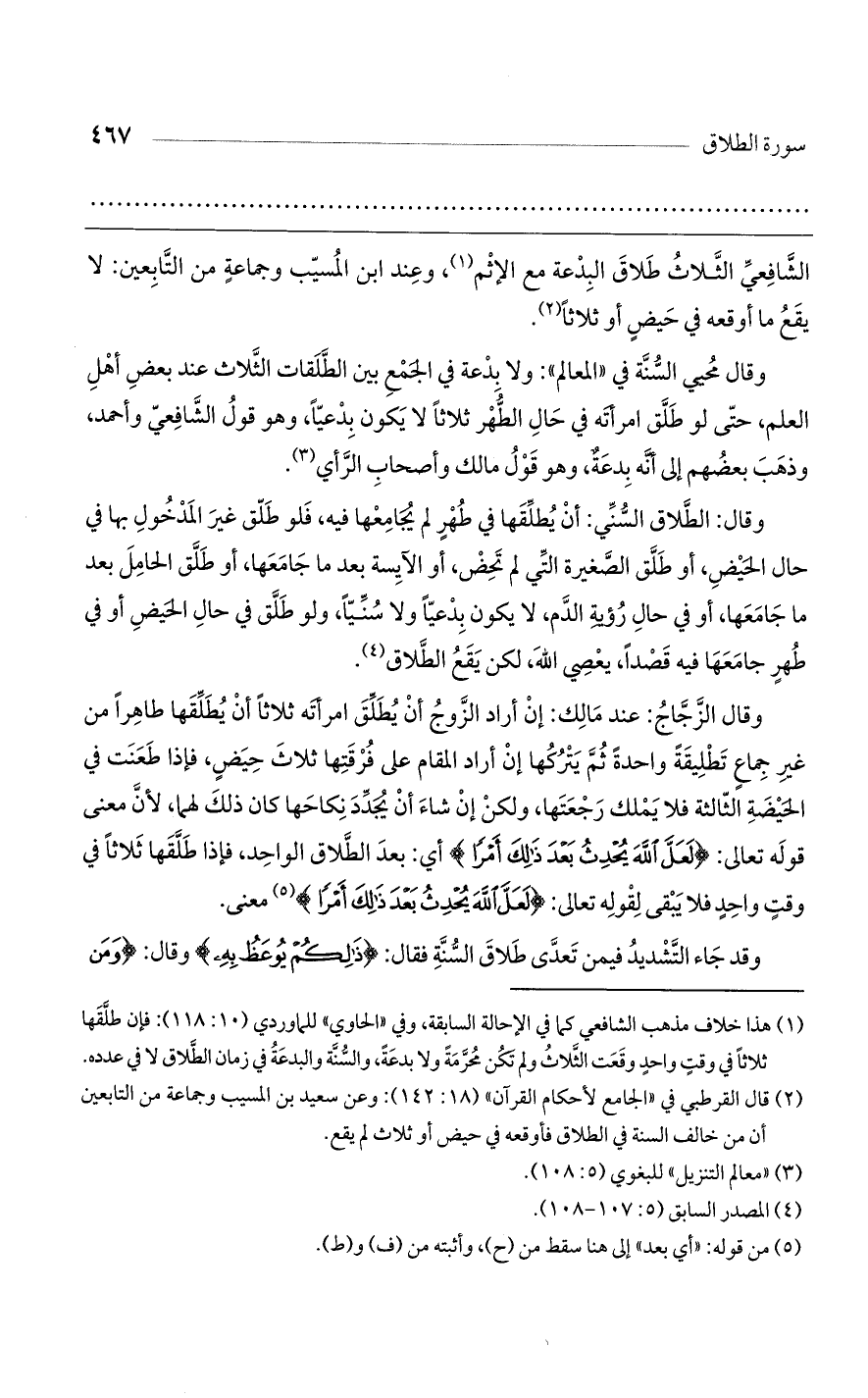 الشافعي الثلاث طلاق البدعة مع الإثم، وعند ابن المسيب وجماعة من التابعين: لا يقع ما أوقعه في حيض أو ثلاثًا.