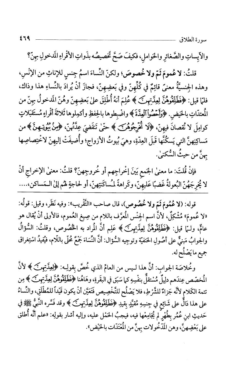 قوله: (لا عموم ثم ولا خصوص)، قال صاحب "التقريب": وفيه نظر، وقيل: قوله: "لا عموم" مشكل، لأن اسم الجنس المعرف باللام من صيغ العموم، فالأولى أن يقال هو عام، ولما قيل: {فَطَلِّقُوهُنَّ لِعِدَّتِهِنَّ} علم أن المراد به الخصوص، وقلت: السؤال والجواب مبني على أصول الحنفية وتوجيه السؤال: أن النساء جمع محل باللام، فيقيد استغراق جميع ما يصلح له.