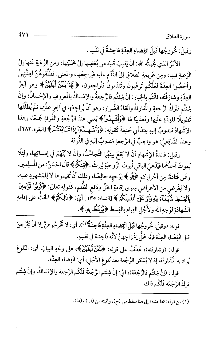 قوله: : (وقيل: خروجها قبل انقضاء العدة فاحشة)، أي: لا تخرجوهن إلا أن يخرجن قبل انقضاء العدة فإنه محل إخراجهن لأنه فاحشة في نفسه.
