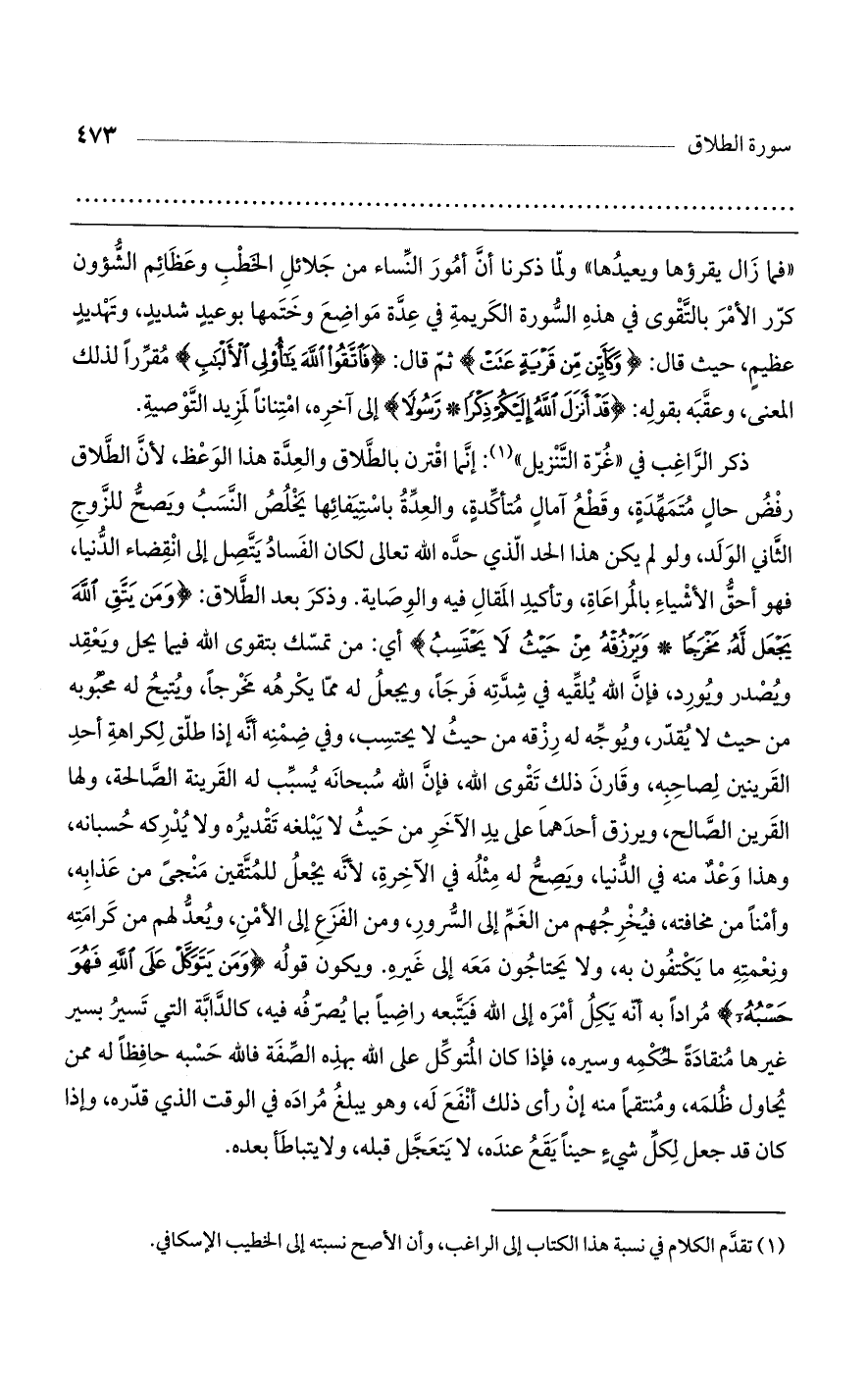 ذكر الراغب في"غرة التنزيل": إنما اقترن بالطلاق والعدة هذا الوعظ، لأن الطلاق رفض حال متمهدة، وقطع آمال متأكدة، والعدة باستيفائها يخلص النسب ويصح للزوج الثاني الولد، ولو لم يكن هذا الح الذي حده الله تعالى لكان الفساد يتصل إلى انقضاء الدنيا، فهو أحق الأشياء بالمراعاة، وتأكيد المقال فيه والوصاية. وذكر بعد الطلاق: {ومَن يَتَّقِ اللَّهَ يَجْعَل لَّهُ مَخْرَجًا * ويَرْزُقْهُ مِنْ حَيْثُ لا يَحْتَسِبُ} أي: من تمسك بتقوى الله فيما يحل ويعقد ويصدر ويورد، فإن الله يلقيه في شدته فرجًا، ويجعل له ممًا يكرهه مخرجًا، ويتيح له محبوبه من حيث لا يقدر، ويوجه له رزقه من حيث لا يحتسب، وفي ضمنه أنه إذا طلق لكراهة أحد القرينين لصاحبه، وقارن ذلك تقوى الله، فإن الله سبحانه يسبب له القرنية الصالحة، ولها القرين الصالح، ويرزق أحدهما على يد الآخر من حيث لا يبلغه تقديره ولا يدركه حسبانه، وهذا وعد منه مخافته، فيخرجهم من الغم إلى السرور، ومن الفزع إلى الأمن، ويعدلهم من كرامته ونعمته ما يكتفون به، ولا يحتاجون معه إلى غيره. ويكون قوله {ومَن يَتَوَكَّلْ عَلَى اللَّهِ فَهُوَ حَسْبُهُ} مرادًا به أنه يكل أمره إلى الله فيتبعه راضيًا بما يصرفه فيه، كالدابة التي تسير بسير غيرها منقادةً لحكمه وسيره، فإذا كان المتوكل على الله بهذه الصفة فالله حسبه حافظًا له ممن يحاول ظلمه، ومنتقمًا منه إن رأى ذلك أنفع له، وهو مراده في الوقت الذي قدره، وإذا كان قد جعل لكل شيء حينًا يقع عنده، لا يتعجل قلبه، ولا يتباطأ بعده.
