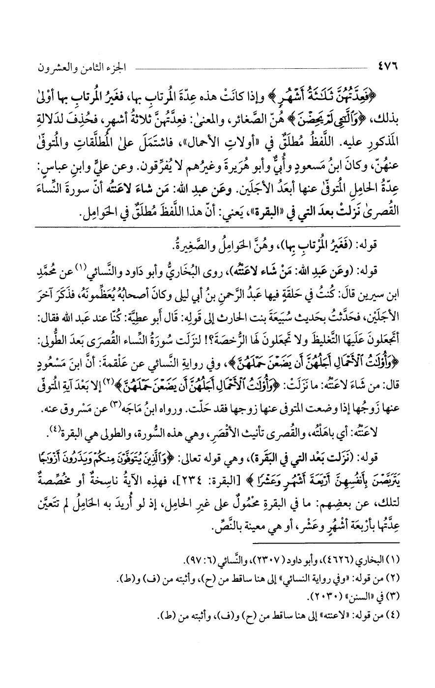 قوله: (وعن عبد الله: من شاء لاعنته)، روى البخاري وأبو داود والنسائي عن محمد ابن سيرين قال: كنت في حلقة فيها عبد الرحمن بن أبي ليلى وكان أصحابه يعظمونه، فذكر آخر الأجلين، فحدثت بحديث سبيعة بنت الحارث إلى قوله: قال أبو عطية: كنا عند عبد الله فقال: أتجعلون عليها التغليظ ولا تجعلون لها الرخصة؟ ! لنزلت سورة النساء القصرى بعد الطولى: {وأُوْلاتُ الأَحْمَالِ أَجَلُهُنَّ أَن يَضَعْنَ حَمْلَهُنَّ}، وفي رواية النسائي عن علقمة: أن ابن مسعود قال: من شاء لاعنته: ما نزلت: {وأُوْلاتُ الأَحْمَالِ أَجَلُهُنَّ أَن يَضَعْنَ حَمْلَهُنّ} إلا بعد آية المتوفى عنها زوجها إذا وضعت المتوفى عنها زوجها فقد حلت. ورواه ابن ماجه عن مسروق عنه.