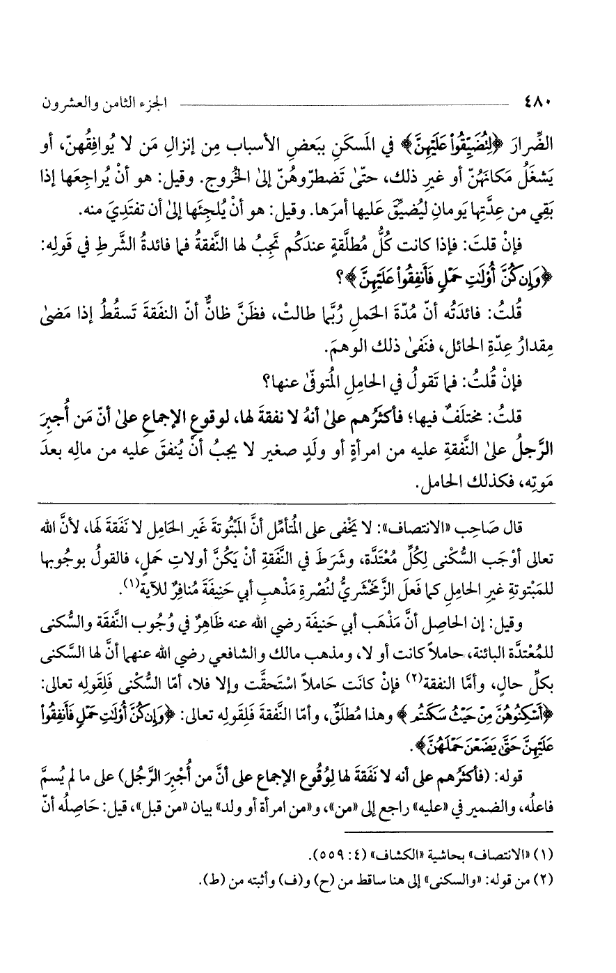 وقال صاحب (الانتصاف): لا يخفى على المتأمل أن المبتوتة غير الحامل لا نفقة لها لأن الله تعالى أوجب السكنى لكلّ معتدة وشرط في النفقة أن يكنّ أولات حمل. فالقول بوجوبها للمبتوتة غير الحامل كما فعل الزمخشري لنصرة مذهب أبي حنيفة منافر للآية.