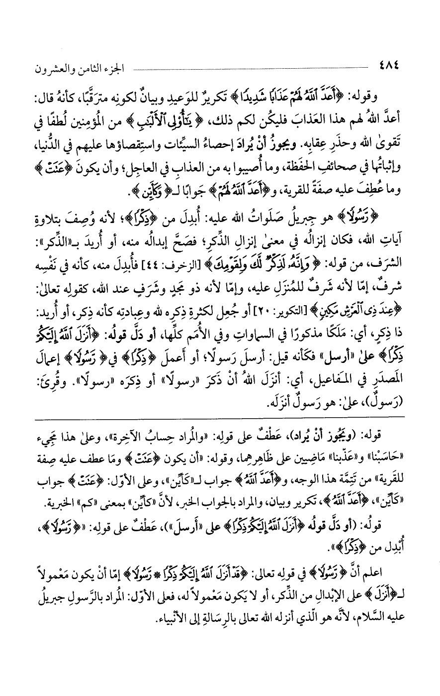 {رَسُولاً} هو جبريل صلوات الله عليه: أبدل من {ذِكْرًا}؛ لأنه وصف بتلاوة آيات الله، فكان إنزاله في معنى إنزال الذكر؛ فصح إبداله منه، أو أريد بـ"الذكر": الشرف، من قوله: {وَإِنَّهُ لَذِكْرٌ لَكَ وَلِقَوْمِكَ} [الزخرف: 44] فأبدل منه، كأنه في نفسه شرف، غما لأنه شرف للمنزل عليه، وإما لأنه ذو مجد وشرف عند الله، كقوله تعالى: {عِنْدَ ذِي الْعَرْشِ مَكِينٍ} بالتكوير: 20] أو جعل لكثرة ذكره لله وعبادته كأنه ذكر، أو أريد: ذا ذكر، أي: ملكًا مذكورًا في السماوات وفي الأمم كلها، أو دل قوله: {أَنزَلَ اللَّهُ إلَيْكُمْ ذِكْرًا} على "أرسل" فكأنه قيل: أرسل رسولًا؛ أو أعمل {ذِكْرًا} في {رَسُولاً} إعمال المصدر في المفاعيل، أي: أنزل الله أن ذكر "رسولًا" أو ذكره "رسولًا". وقرئ: (رسول)، على: هو رسول أنزله.