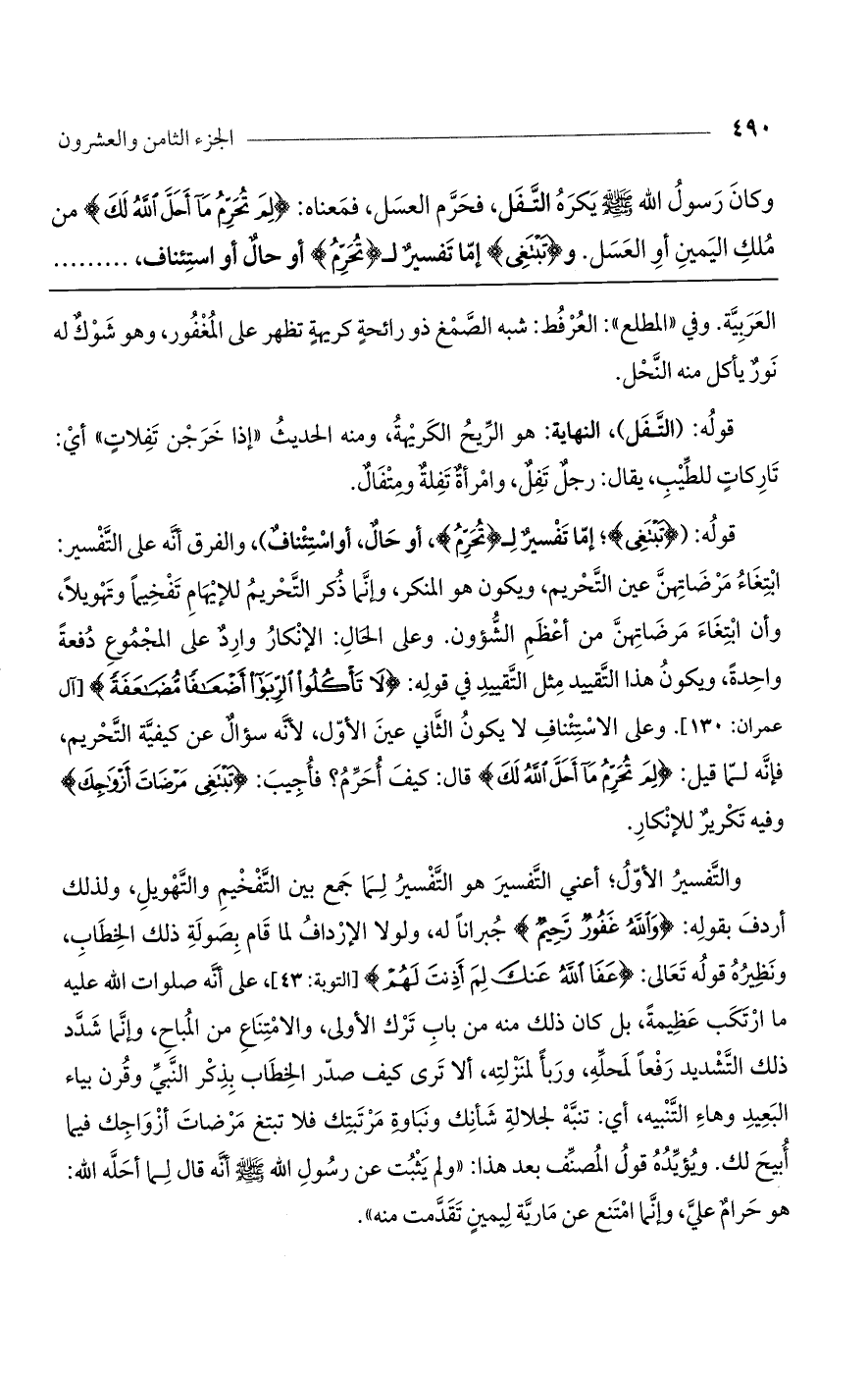 والتفسير الأول؛ أعني التفسير لما جمع بين التفخيم والتهويل، ولذلك أردف بقوله: {واللَّهُ غَفُورٌ رَّحِيمٌ} جبرانًا له، ولولا الإرداف لما قام بصولة ذلك الخطاب، ونظيره قوله تعالى: {عَفَا اللَّهُ عَنْكَ لِمَ أَذِنْتَ لَهُمْ} [التوبة: 43]، على أنه صلوات الله عليه ما ارتكب عظيمةً، بل كان ذلك منه من باب ترك الأولى، والامتناع من المباح، وإنما شدد ذلك التشديد رفعًا لمحله، وربًا لمنزلته، ألا ترى كيف صدر الخطاب بذكر النبي وقرن بياء البعيد وهاء التنبيه، أي: تنبه لجلالة شأنك ونباوة مرتبتك فلا تبتغ مرضات أزواجك فيما أبيح لك. ويؤيده قول المصنف بعد هذا: "ولم يثبت عن رسول الله صلى الله عليه وسلم أنه قال لما أحله الله: هو حرام علي، وإنما امتنع عن مارية ليمين تقدمت منه".