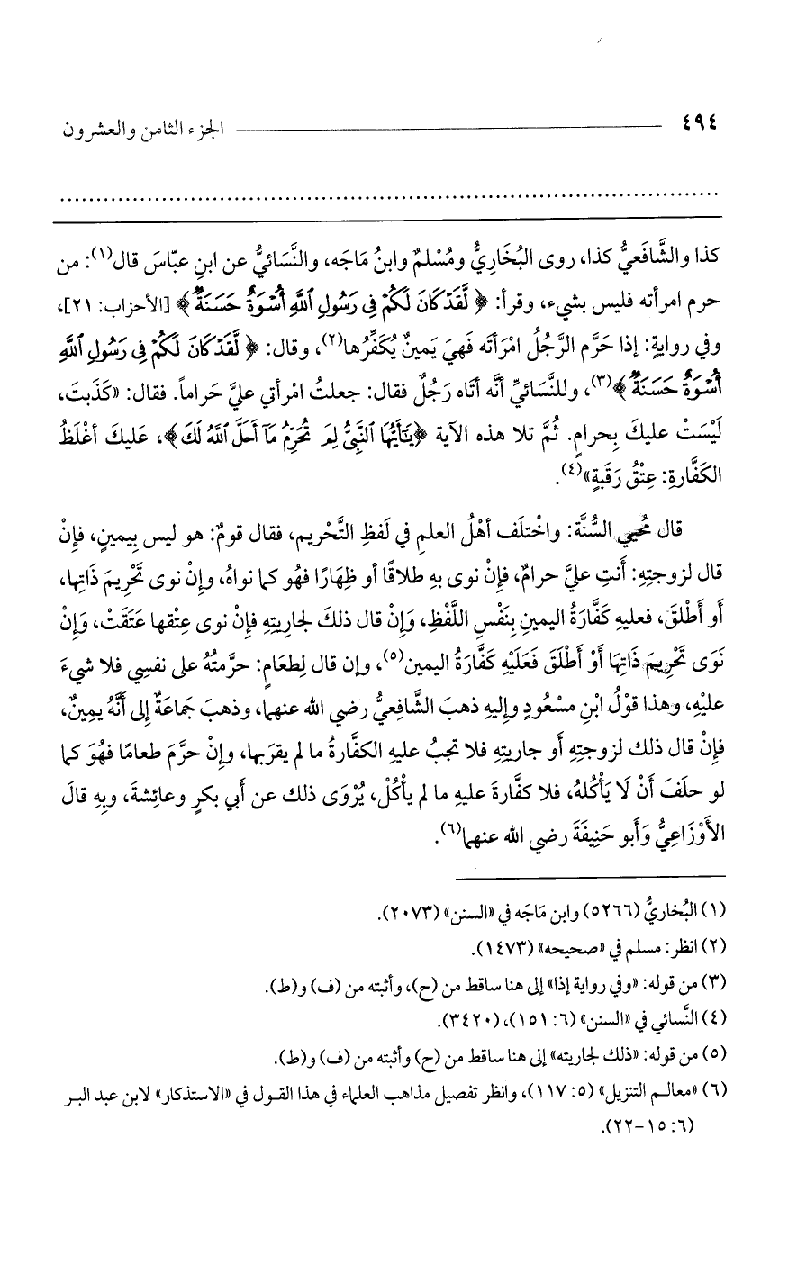 كذا والشافعي كذا، روى البخاري ومسلم وابن ماجه، والنسائي عن ابن عباس قال: من حرم امرأته فليس بشيء، وقرأ: {لَقَدْ كَانَ لَكُمْ فِي رَسُولِ اللَّهِ أُسْوَةٌ حَسَنَةٌ} [الأحزاب: 21]، وفي رواية: إذا حرم الرجل امرأته فهي يمين يكفرها، وقال: {لَقَدْ كَانَ لَكُمْ فِي رَسُولِ اللَّهِ أُسْوَةٌ حَسَنَةٌ}، وللنسائي أنه أتاه رجل فقال: جعلت امرأتي علي حرامًا. فقال: "كذبت، ليست عليك بحرام. ثم تلا هذه الآية {يَا أَيُّهَا النَّبِيُّ لِمَ تُحَرِّمُ مَا أَحَلَّ اللَّهُ لَكَ}، عليك أغلظ الكفارة: عتق رقبة".