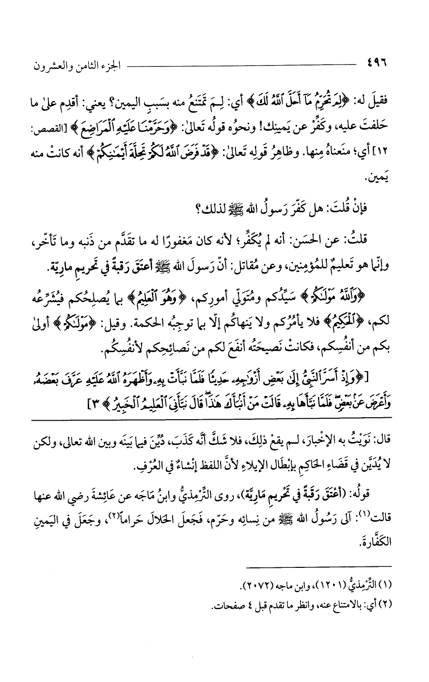 فقيل له: {لِمَ تُحَرِّمُ مَا أَحَلَّ اللَّهُ لَكَ} أي: لم تمتنع منه بسبب اليمين؟ يعني: أقدم على ما حلفت عليه، وكفر عن يمينك! ونحوه قوله تعالى: {وَحَرَّمْنَا عَلَيْهِ الْمَرَاضِعَ} [القصص: 12] أي؛ منعناه منها. وظاهر قوله تعالى: {قَدْ فَرَضَ اللَّهُ لَكُمْ تَحِلَّةَ أَيْمَانِكُمْ} أنه كانت منه يمين.