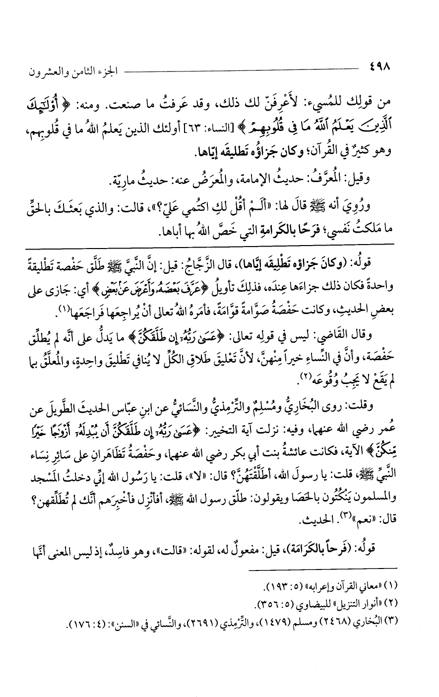 قوله: (وكان جزاءها تطليقه إياها)، قال الزجاج: قيل: إن النبي صلى الله عليه وسلم طلق حفصة تطليقةً واحدةً فكان ذلك جزاءها عنده، فذلك تأويل {عَرَّفَ بَعْضَهُ وأَعْرَضَ عَنْ بَعْضٍ} أي: جازى على بعض الحديث، وكانت حفصة صوامةً قوامةً، فأمره الله تعالى أن يراجعها فراجعها.