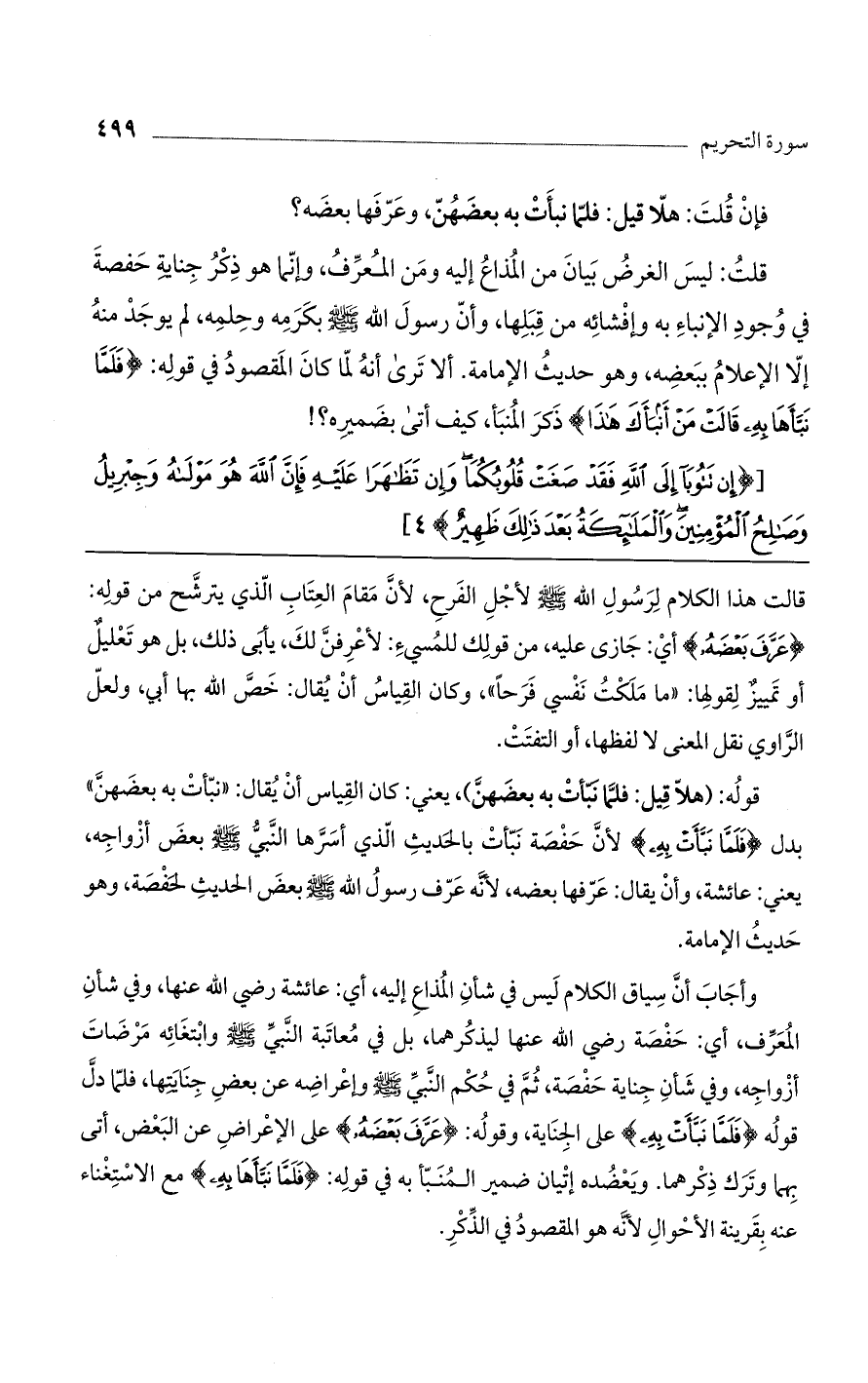 وأجاب أن سياق الكلام ليس في شأن المذاع إليه، أي: عائشة رضي الله عنها، وفي شأن المعروف، أي: حفصة رضي الله عنهما ليذكرهما، بل في معاتبة النبي صلى الله عليه وسلم وابتغائه مرضات أزواجه، وفي شأن جناية حفصة، ثم في حكم النبي صلى الله عليه وسلم وإعراضه عن بعض جنايتها، فلما دل قوله {فَلَمَّا نَبَّأَتْ بِهِ} على الجناية، وقوله: {عَرَّفَ بَعْضَهُ} على الإعراض عن البعض، أتى بهما وترك ذكرهما. ويعضده إتيان ضمير المنبأ به في قوله: {فَلَمَّا نَبَّأَهَا بِهِ} مع الاستغناء عنه بقرينة الأحوال لأنه هو المقصود في الذكر.