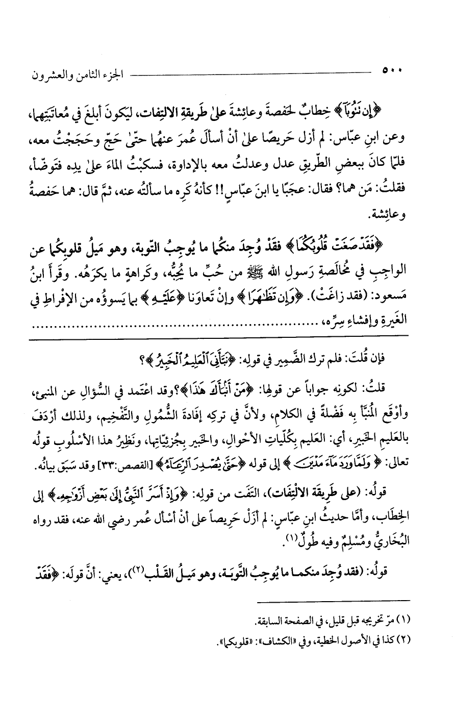 {إن تَتُوبَا} خطاب لحفصة وعائشة على طريقة الالتفات، ليكون أبلغ في معاتبتهما، وعن ابن عباس: لم أزل حريصًا على أن أسأل عمر عنهما حتى حج وحججت معه، فلما كان ببعض الطريق عدل وعدلت معه بالإداوة، فسكبت الماء على يده فتوضأ، فقلت: من هما؟ فقال: عجبًا يا ابن عباس! ! كأنه كره ما سألته عنه، ثم قال: هما حفصة وعائشة.