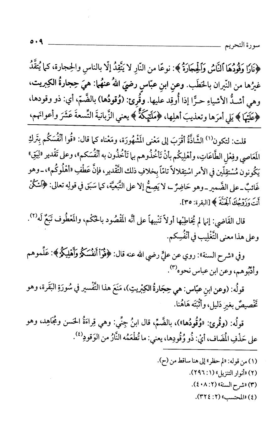 وفي"شرح السنة": روي عن علي رضي الله عنه قال: {قُوا أَنفُسَكُمْ وَأَهْلِيكُمْ}: علموهم وأدبوهم، وعن ابن عباس نحوه.