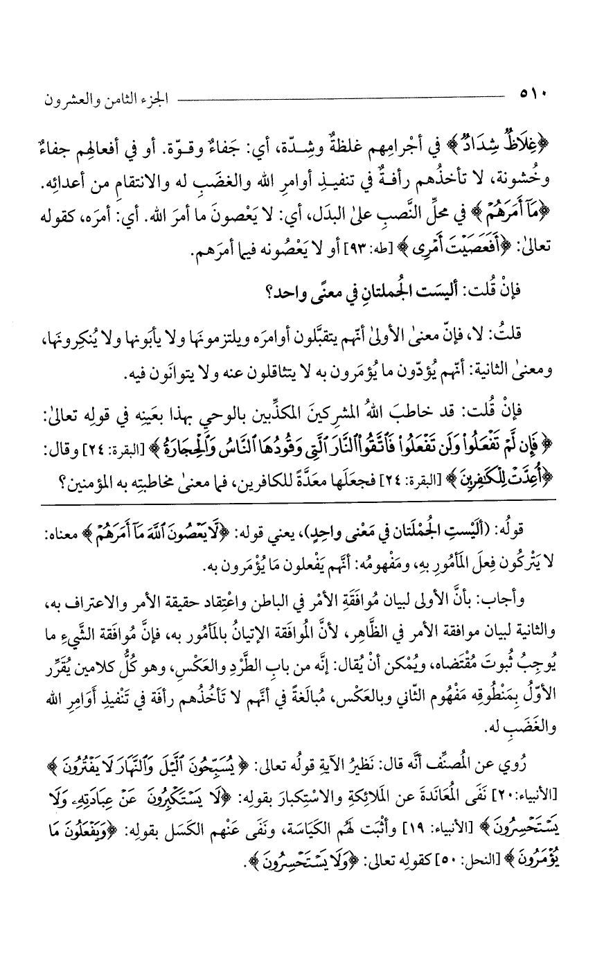 روي عن المصنف أنه قال: نظير الآية قوله تعالى: {يُسَبِّحُونَ الَّليلَ والنَّهَارَ لا يَفْتَرُونَ} [الأنبياء: 20] نفى المعاندة عن الملائكة والاستكبار بقوله: {لا يَسْتَكْبِرُونَ عَن عِبَادَتِهِ وَلا يَسْتَحْسِرُونَ} [الأنبياء: 19] وأثبت لهم الكياسة، ونفى عنهم الكسل بقوله: {وَيَفْعَلُونَ مَا يُؤْمَرُونَ} [النحل: 50] كقوله تعالى: {وَلا يَسْتَحْسِرُونَ}.