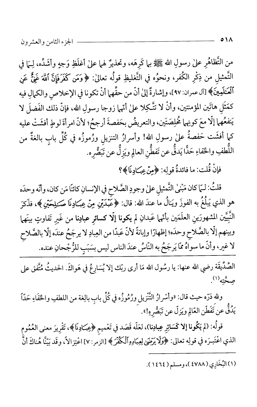 من التظاهر على رسول الله صلى الله عليه وسلم بما كرهه، وتحذير لهما على أغلظ وجه وأشده، لما في التمثيل من ذكر الكفر، ونحوه في التغليظ قوله تعالى: {ومَن كَفَرَ فَإنَّ اللَّهَ غَنِيٌّ عَنِ العَالَمِينَ} [آل عمران: 97]، وإشارة إلى أن من حقهما أن تكونا في الإخلاص والكمال فيه كمثل هاتين المؤمنتين، وأن لا تتكلا على أنهما زوجا رسول الله، فإن ذلك الفضل لا ينفعهما إلا مع كونهما مخلصتين، والتعريض بحفصة أرجح؛ لأن امرأة لوط أفشت عليه كما أفشت حفصة على رسول الله! وأسرار التنزيل ورموزه في كل باب بالغة من اللطف والخفاء حدا يدق عن تفطن العالم ويزل عن تبصره.