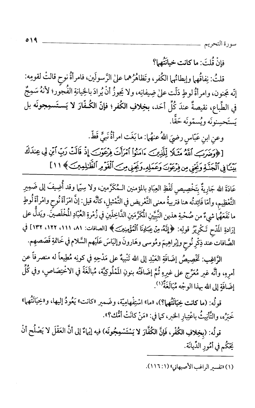 قوله: (ما كانت خيانتهما؟ )، "ما" استفهاميةً، وضمير "كانت" يعود إليها، و"خيانتهما" خبره، والتأنيث باعتبار الخبر، كما في: "من كانت أمك؟ ".