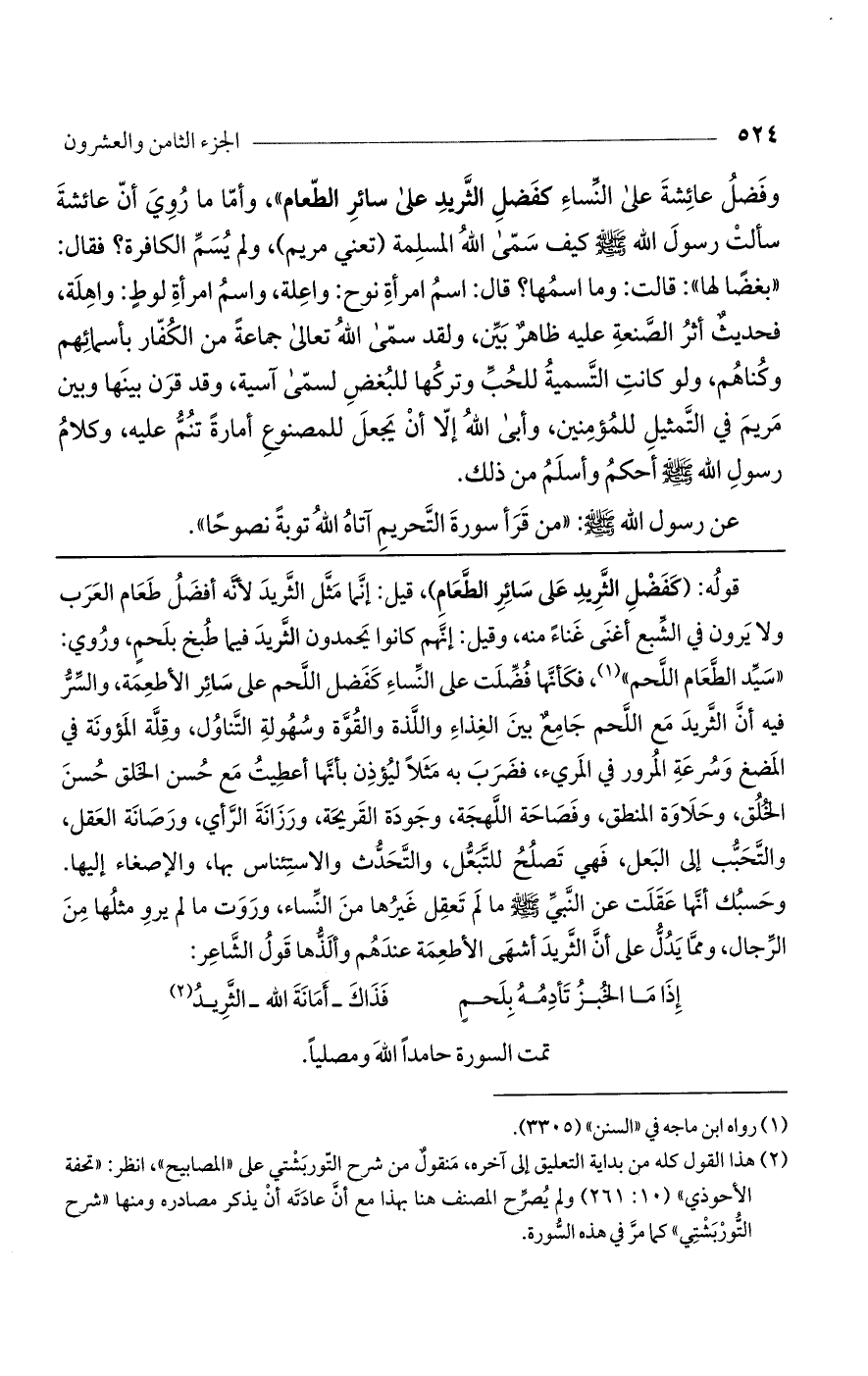 وحسبك أنها عقلت عن النبي صلى الله عليه وسلم ما لم تعقل غيرها من النساء، وروت ما لم يرو مثلها من الرجال، ومما يدل على أن الثريد أشهى الأطعمة عندهم وألذها قول الشاعر:
