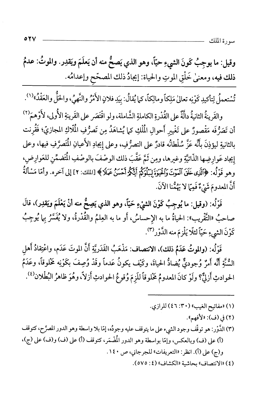 والقرينة الثانية دالة على القدرة الكاملة الشاملة، ولو اقتصر على القرينة الأولى، لأوهم أن تصرفه مقصور على تغير أحوال الملك كما يشاهد من تصرف الملاك المجازي؛ فقرنت بالثانية ليؤذن بأنه عز سلطانه قادر على التصرف، وعلى إيجاد الأعيان المتصرف فيها، وعلى إيجاد عوارضها الذاتية وغيرها، ومن ثم عقب ذلك الوصف بالوصف المتضمن للعوارض، وهو قوله: {الَّذِي خَلَقَ المَوْتَ والْحَيَاةَ لِيَبْلُوَكُمْ أَيُّكُمْ أَحْسَنُ عَمَلاً} [الملك: 2] إلى آخره. وأما مسألة أن المعدوم شيء فمها لا يهمنا الآن.