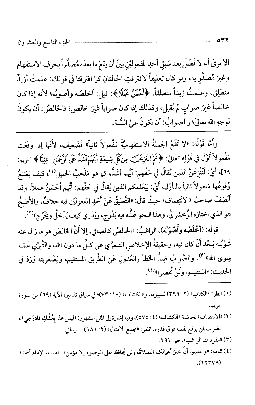 قوله: (أخلصه وأصوبه)، الراغب: "الخالص كالصافي، إلا أن الخالص هو ما زال عنه شربه بعد أن كان فيه، وحقيقة الإخلاص التعري عن كل ما دون الله، والتبري عما سوى الله". والصواب ضد الخطأ والعدول عن الطريق المستقيم، ولصعوبته ورد في الحديث: "استقيموا ولن تحصوا".