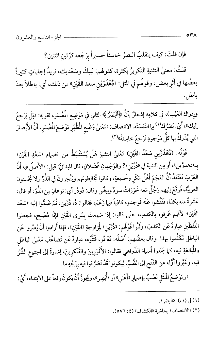 قلت: معنى التثنية التكرير بكثرة، كقولهم: لبيك وسعديك، تريد إجابات كثيرة بعضها في إثر بعض، وقولهم في المثل "دهدرين سعد القين" من ذلك، أي: باطلا بعد باطل.
