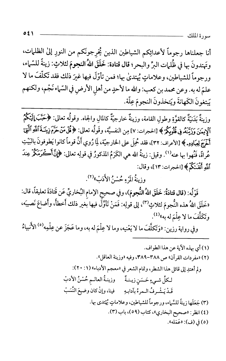 قوله: (قال قتادة: خلق الله النجوم)، وفي صحيح الإمام البخاري عن قتادة تعليقًا، قال: "خلق الله هذه النجوم لثلاث، إلى قوله: فمن تأول فيها بغير ذلك أخطأ، وأضاع نصيبه، وتكلف ما لا علم له به".