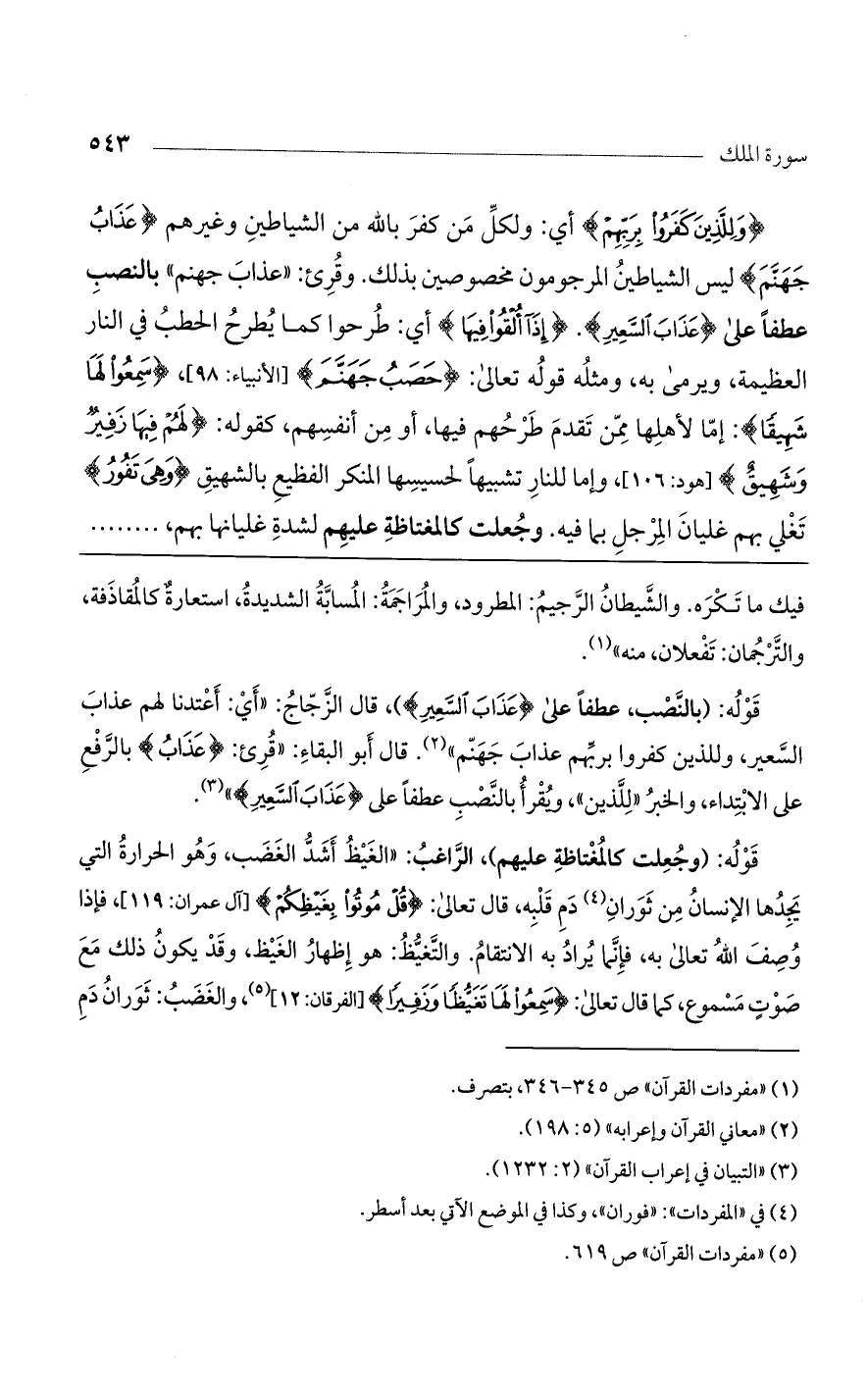 قوله: (وجعلت كالمغتاظة عليهم)، الراغب: "الغيظ أشد الغضب، وهو الحرارة التي يجدها الإنسان من ثوران دم قبله، قال تعالى: {قُلْ مُوتُوا بِغَيْظِكُمْ} [آل: عمران: 119]، فإذا وصف الله تعالى به، فإنها يراد به الانتقام. والتغيظ: هو إظهار الغيظ، وقد يكون ذلك مع صوت مسموع، كما قال تعالى: {سَمِعُوا لَهَا تَغَيُّظًا وَزَفِيرًا} [الفرقان: 12]، والغضب: ثوران دم