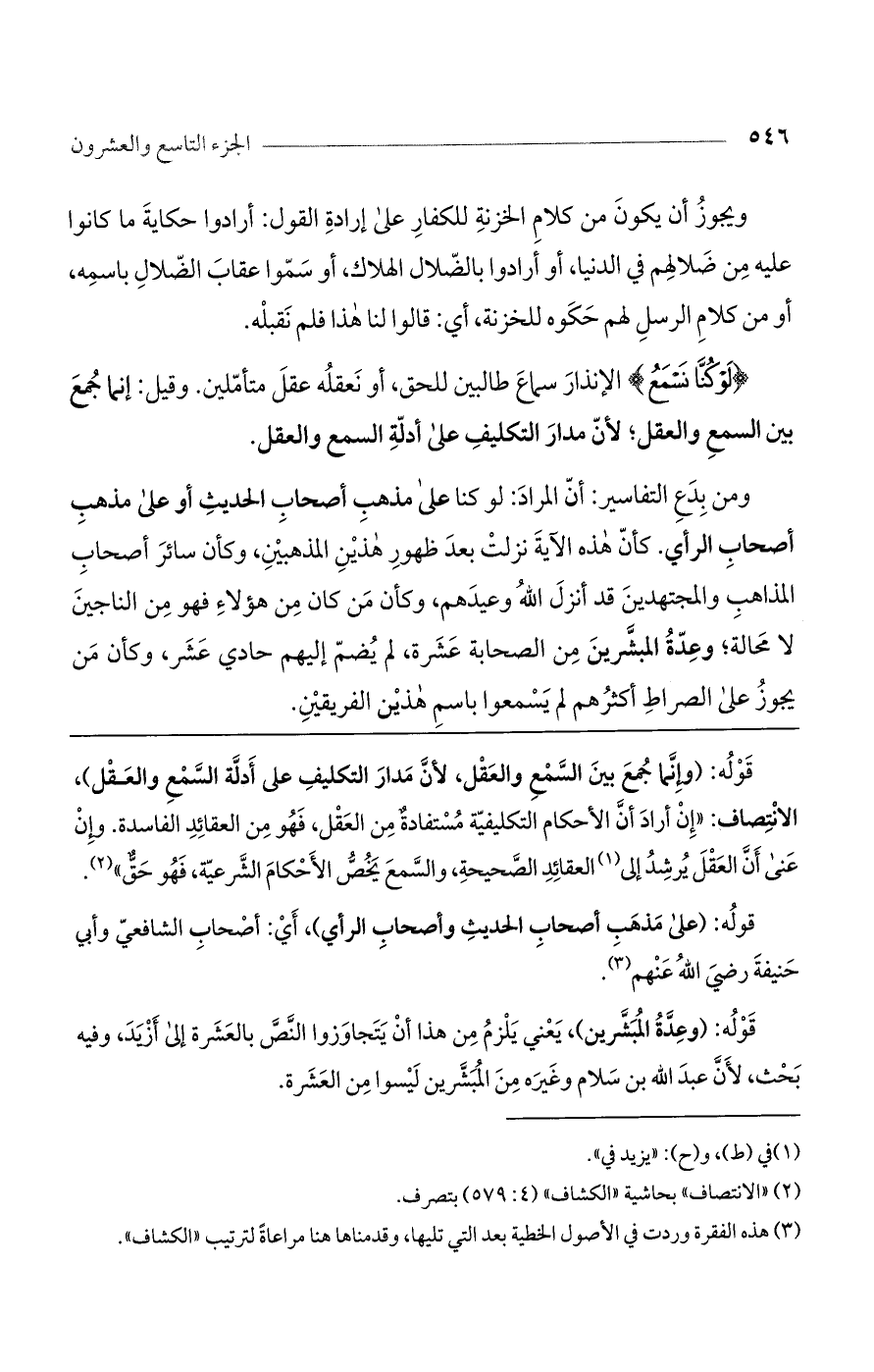قوله: (وإنما جمع بين السمع والعقل، لأن مدار التكليف على أدلة السمع والعقل)، الانتصاف: "إن أراد أن الأحكام التكليفية مستفادة من العقل، فهو من العقائد الفاسدة. وإن عنى أن العقل يرشد إلى العقائد الصحيحة، والسمع يخص الأحكام الشرعية، فهو حق".