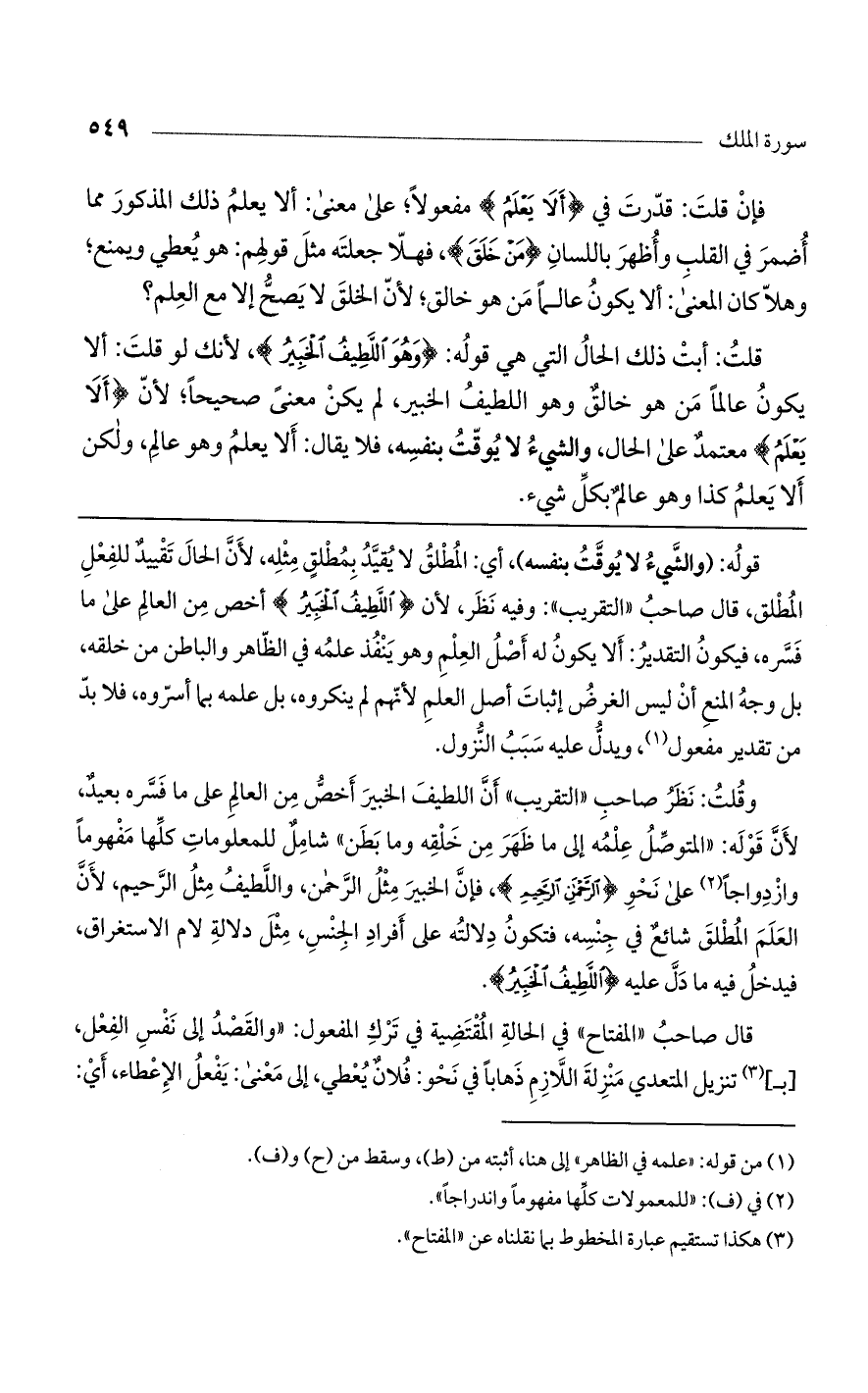 قوله: (والشيء لا يوقت بنفسه)، أي: المطلق لا يقيد بمطلق مثله، لأن الحال تقييد للفعل المطلق، قال صاحب "التقريب": وفيه نظر، لأن {اللَّطِيفُ الخَبِيرُ} أخص من العالم على ما فسره، فيكون التقدير: ألا يكون له أصل العلم وهو ينفذ علمه في الظاهر والباطن من خلقه، بل وجه المنع أن ليس الغرض إثبات أصل العلم لأنهم لم ينكروه، بل علمه بما أسروه، فلا بد من تقدير مفعول، ويدل عليه سبب النزول.