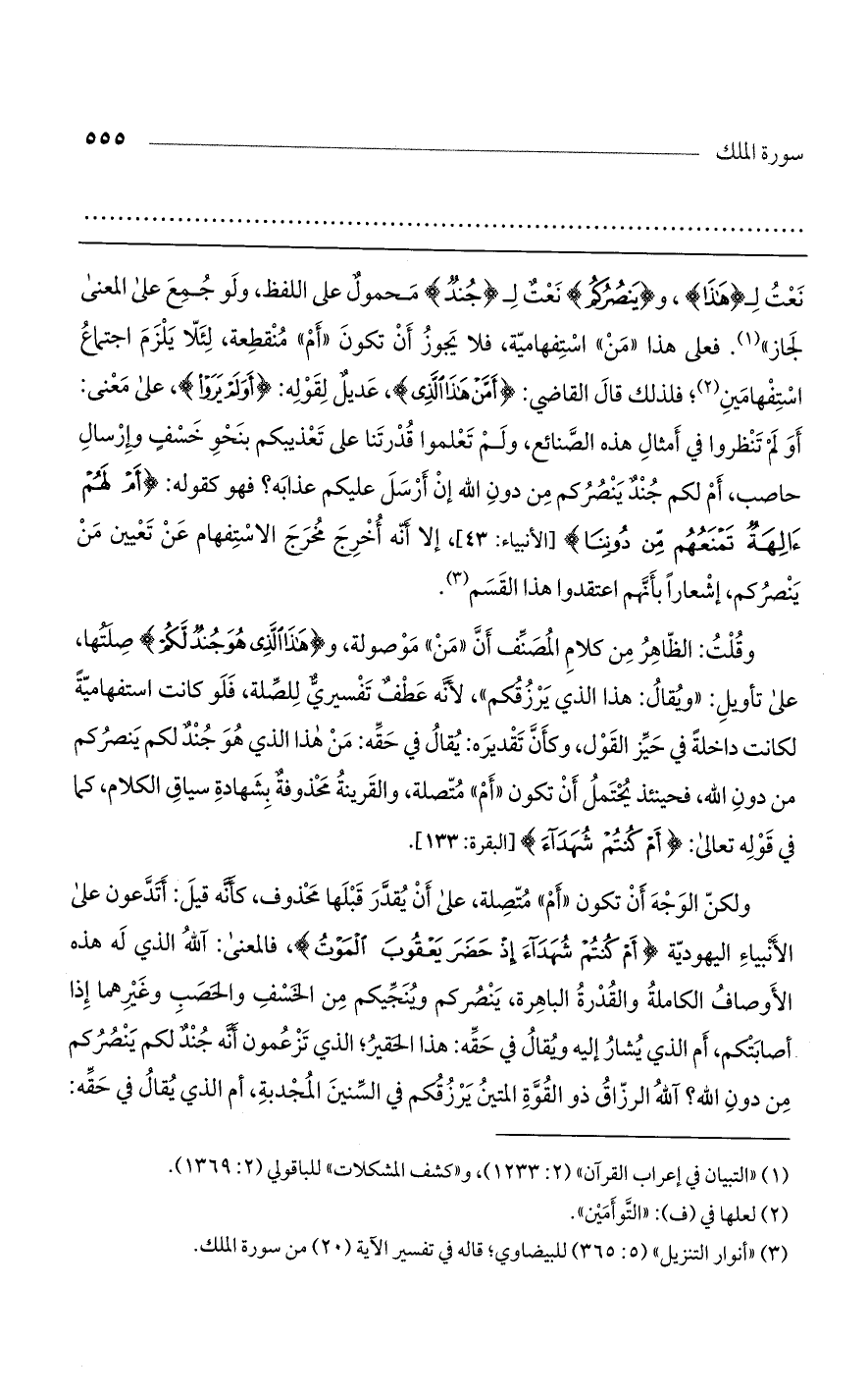 نعت لـ {هَذَا}، و {يَنصُرُكُم} نعت لـ {جُندٌ} محمول على اللفظ، ولو جمع على المعنى لجاز". فعلى هذا "من" استفهامية، فلا يجوز أن يكون "أم" منقطعة، لئلا يلزم اجتماع استفهامين؛ فلذلك قال القاضي: {أَمَّنْ هَذَا الَّذِي}، عديل لقوله: {أَوَ لَمْ يَرَوا}، على معنى: أو لم تنظروا في أمثال هذه الصنائع، ولم تعلموا قدرتنا على تعذيبكم بنحو خسف وإرسال حاصب، أم لكم جند ينصركم من دون الله إن أرسل عليكم عذابه؟ فهو كقوله: {أَمْ لَهُمْ آَلِهَةٌ تَمْنَعُهُمْ مِنْ دُونِنَا} [الأنبياء: 43]، إلا أنه أخرج مخرج الاستفهام عن تعيين من ينصركم، إشعارًا بأنهم اعتقدوا هذا القسم.