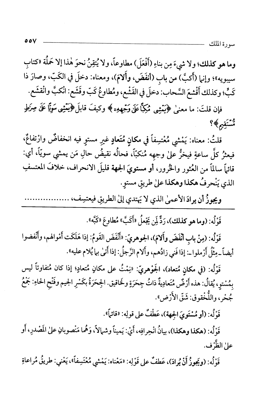 قلت: معناه: يمشي معتسفًا في مكان متعاد غير مستو فيه انخفاض وارتفاع، فيعثر كل ساعة فيخر على وجهه منكبا، فحاله نقيض حال من يمشي سويا، أي: قائما سالما من العثور والخرور، أو مستوى الجهة قليل الانحراف، خلال المعتسف الذي ينحرف هكذا وهكذا على طريق مستو.
