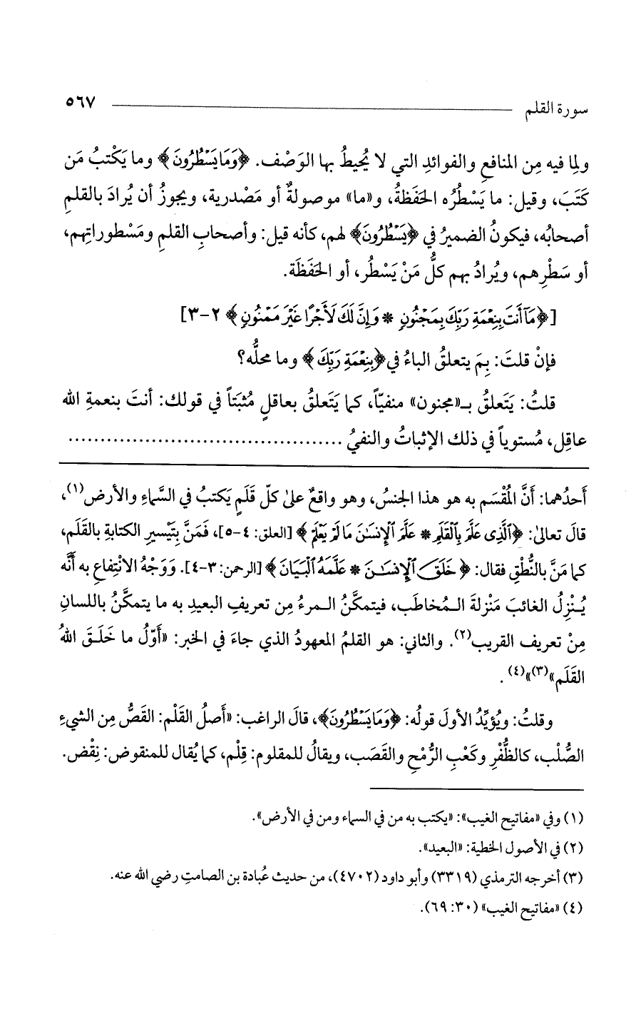 أحدهما: أن المقسم به هو هذا الجنس، وهو واقع عل كل قلم يكتب في السماء والأرض، قال تعالى: {الَّذِي عَلَّمَ بِالْقَلَمِ * عَلَّمَ الإنسَانَ مَا لَمْ يَعْلَمْ} [العلق: 4 - 5]، فمن بتيسير الكتابة بالقلم، كما من بالنطق فقال: {خَلَقَ الإنسَانَ * عَلَّمَهُ البَيَانَ} [الرحمن: 3 - 4]. ووجه الانتفاع به أنه ينزل الغائب منزلة المخاطب، فيتمكن المرء من تعريف البعيد به ما يتمكن باللسان من تعريف القريب. والثاني: هو القلم المعهود الذي جاء في الخبر: "أول ما خلق الله القلم"".