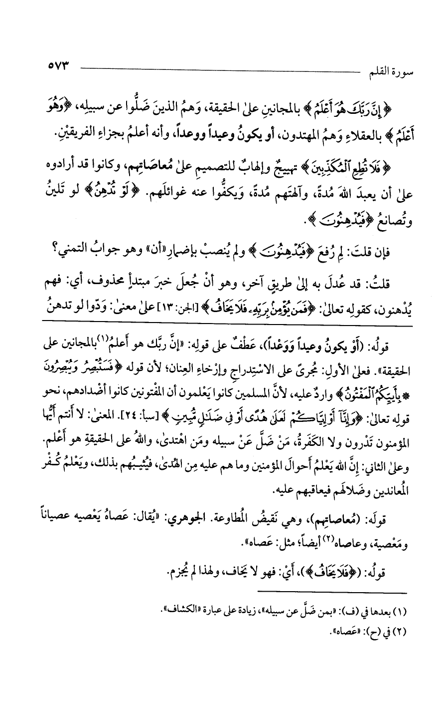 قوله: (أو يكون وعيدًا ووعدًا)، عطف على قوله: "إن ربك هو أعلم بالمجانين على الحقيقة". فعلى الأول: مجرى على الاستدراج وإرخاء العنان؛ لأن قوله {فَسَتُبْصِرُ ويُبْصِرُونَ * بِأَيِّكُمُ المَفْتُونُ} وارد عليه، لأن المسلمين كانوا يعلمون أن المفتونين كانوا أضدادهم، نحو قوله تعالى: {وَإِنَّا أَوْ إِيَّاكُمْ لَعَلَى هُدًى أَوْ فِي ضَلَالٍ مُبِينٍ} [سبأ: 24]. المعنى: لا أنتم أيها المؤمنون تدرون ولا الكفرة، من ضل عن سبيله ومن اهتدى، والله على الحقيقة هو أعلم.