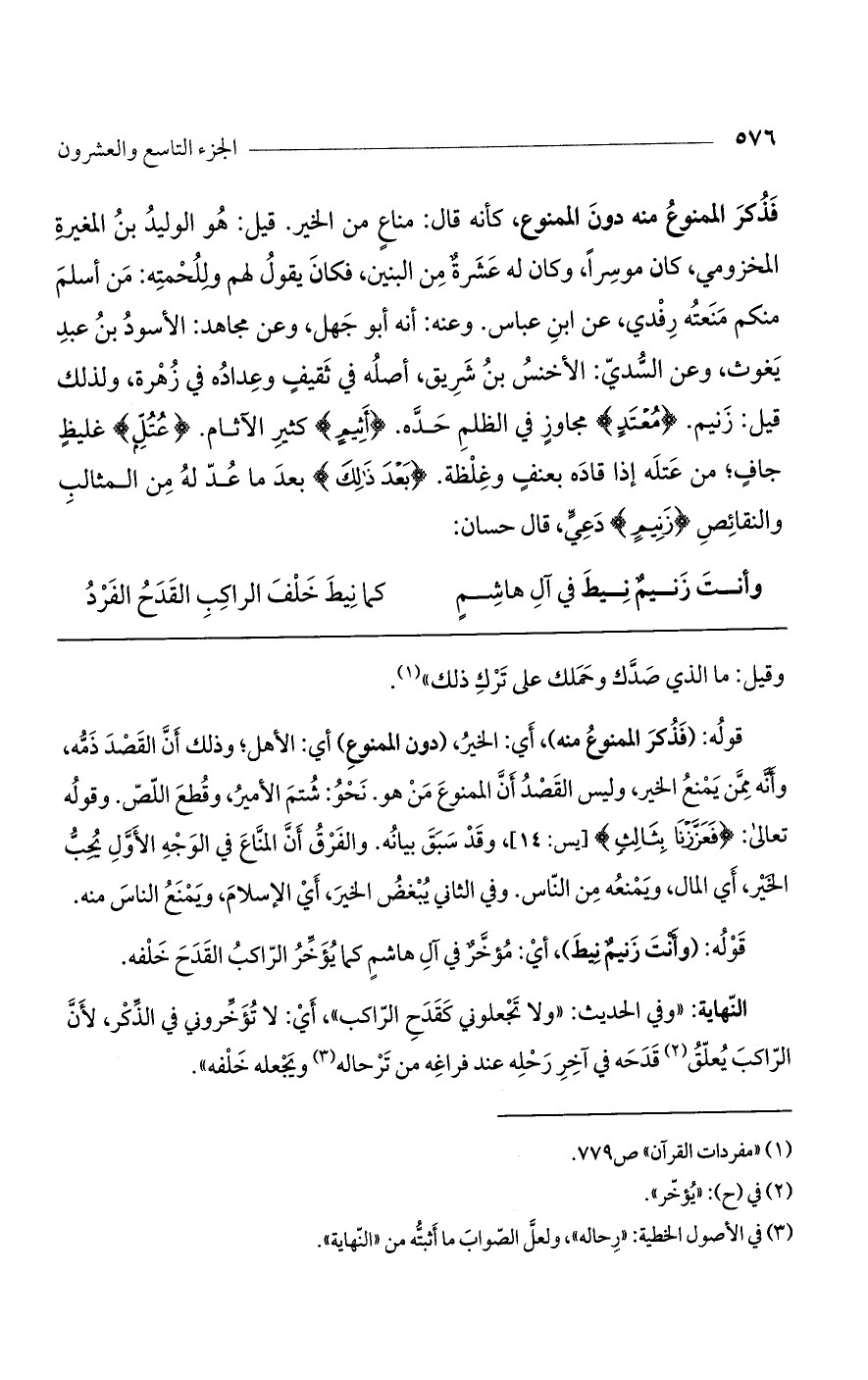 قوله: (فذكر الممنوع منه)، أي: الخير، (دون الممنوع) أي: الأهل؛ وذلك أن القصد ذمه، وأنه ممن يمنع الخير، وليس القصد أن الممنوع من هو. نحو: شتم الأمير، وقطع اللص. وقوله تعالى: {فَعَزَّزْنَا بِثَالِثٍ} [بس: 14]، وقد سبق بيانه. والفرق أن المناع في الوجه الأول يحب الخير، أي: المال، ويمنعه من الناس. وفي الثاني يبغض الخير، أي الإسلام، ويمنع الناس منه.