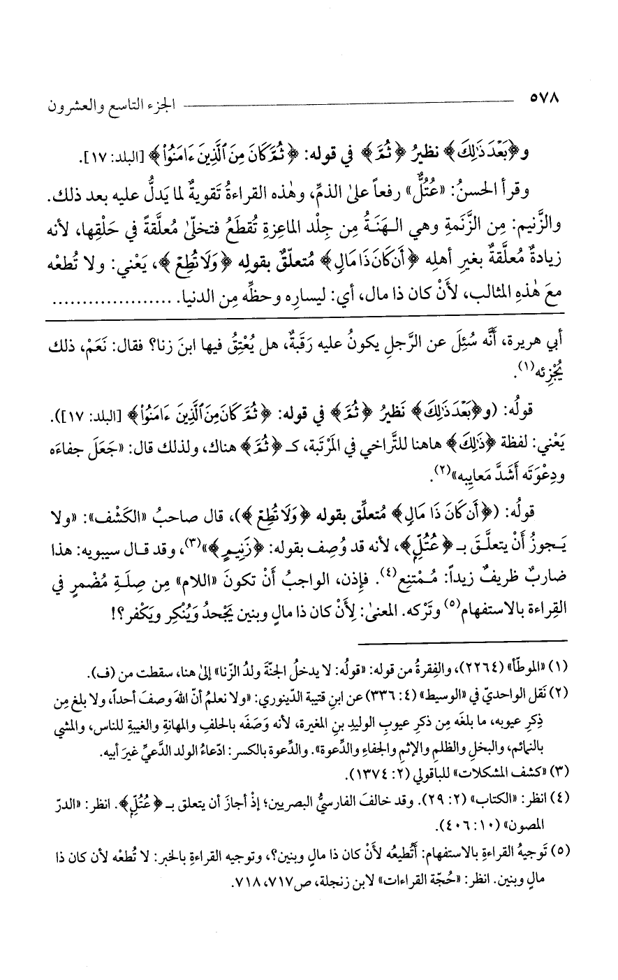 وقرأ الحسن: "عتل" رفعا على الذم، وهذه القراءة تقويه لما يدل عليه بعد ذلك. والزنيم: من الزنمة وهي الهنة من جلد الماعزة تقطع فتخلى معلقة في حلقها، لأنه زيادة معلقة بغير {أهله أَن كَانَ ذَا مَالٍ} متعلق بقوله {ولا تُطِعْ}، يعني: ولا تطعه مع هذه المثالب، لأن كان ذا مال، أي: ليساره وحظه من الدنيا