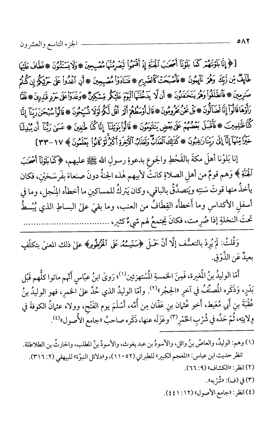 [{إنَّا بَلَوْنَاهُمْ كَمَا بَلَوْنَا أَصْحَابَ الجَنَّةِ إذْ أَقْسَمُوا لَيَصْرِمُنَّهَا مُصْبِحِينَ * ولا يَسْتَثْنُونَ * فَطَافَ عَلَيْهَا طَائِفٌ مِّن رَّبِّكَ وهُمْ نَائِمُونَ * فَأَصْبَحَتْ كَالصَّرِيمِ * فَتَنَادَوْا مُصْبِحِينَ * أَنِ اغْدُوا عَلَى حَرْثِكُمْ إن كُنتُمْ صَارِمِينَ * فَانطَلَقُوا وهُمْ يَتَخَافَتُونَ * أَن لاَّ يَدْخُلَنَّهَا اليَوْمَ عَلَيْكُم مِّسْكِينٌ * وغَدَوْا عَلَى حَرْدٍ قَادِرِينَ * فَلَمَّا رَأَوْهَا قَالُوا إنَّا لَضَالُّونَ * بَلْ نَحْنُ مَحْرُومُونَ * قَالَ أَوْسَطُهُمْ أَلَمْ أَقُل لَّكُمْ لَوْلا تُسَبِّحُونَ * قَالُوا سُبْحَانَ رَبِّنَا إنَّا كُنَّا ظَالِمِينَ * فَأَقْبَلَ بَعْضُهُمْ عَلَى بَعْضٍ يَتَلاوَمُونَ * قَالُوا يَا ويْلَنَا إنَّا كُنَّا طَاغِينَ * عَسَى رَبُّنَا أَن يُبْدِلَنَا خَيْرًا مِّنْهَا إنَّا إلَى رَبِّنَا رَاغِبُونَ * كَذَلِكَ العَذَابُ ولَعَذَابُ الآخِرَةِ أَكْبَرُ لَوْ كَانُوا يَعْلَمُونَ} 17 - 33].