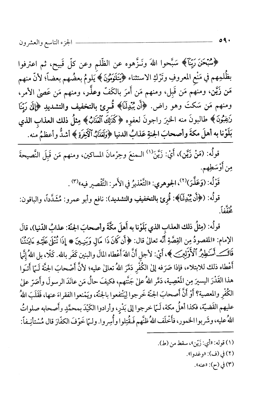 {سُبْحَانَ رَبِّنَا} سبحوا الله ونزهوه عن الظلم وعن كل قبيح، ثم اعترفوا بظلمهم في منع المعروف وترك الاستثناء {يَتَلاوَمُونَ} يلوم بعضهم بعضا؛ لأن منهم من زين، ومنهم قبل، ومنهم من أمر بالكف وعذر، ومنهم من عصى الأمر، ومنهم من سكت وهو راض. {أَن يُبْدِلَنَا} قرئ بالتخفيف والتشديد {إلَى رَبِّنَا رَاغِبُونَ} طالبون منه الخير راجون لعفوه {كَذَلِكَ العَذَابُ} مثل ذلك العذاب الذي بلونا به أهل مكة وأصحاب الجنة عذاب الدنيا {ولَعَذَابُ الآخِرَةِ} أشد وأعظم منه.