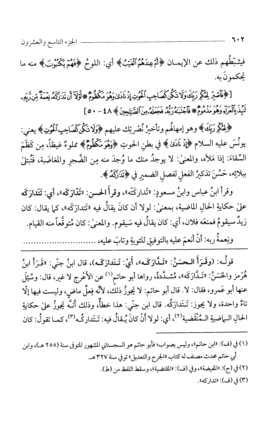 قوله: (وقرأ الحسن: "تداركه"، أي: تتداركه)، قال ابن جني: "قرأ ابن هرمز والحسن: "تداركه"، مشددة، رواها أبو حاتم عن الأعرج لا غير، قال: وسئل عنها أبو عمرو، فقال: لا. قال أبو حاتم: لا يجوز ذلك، لأنه فعل ماض، وليست فيها إلا تاء واحدة، ولا يجوز: تتداركه. قال ابن جني: هذا خطأ، وذلك أنه يجوز على حكاية الحال الماضية المنقضية، أي: لولا أن كان يقال فيه: تتداركه، كما تقول: كان
