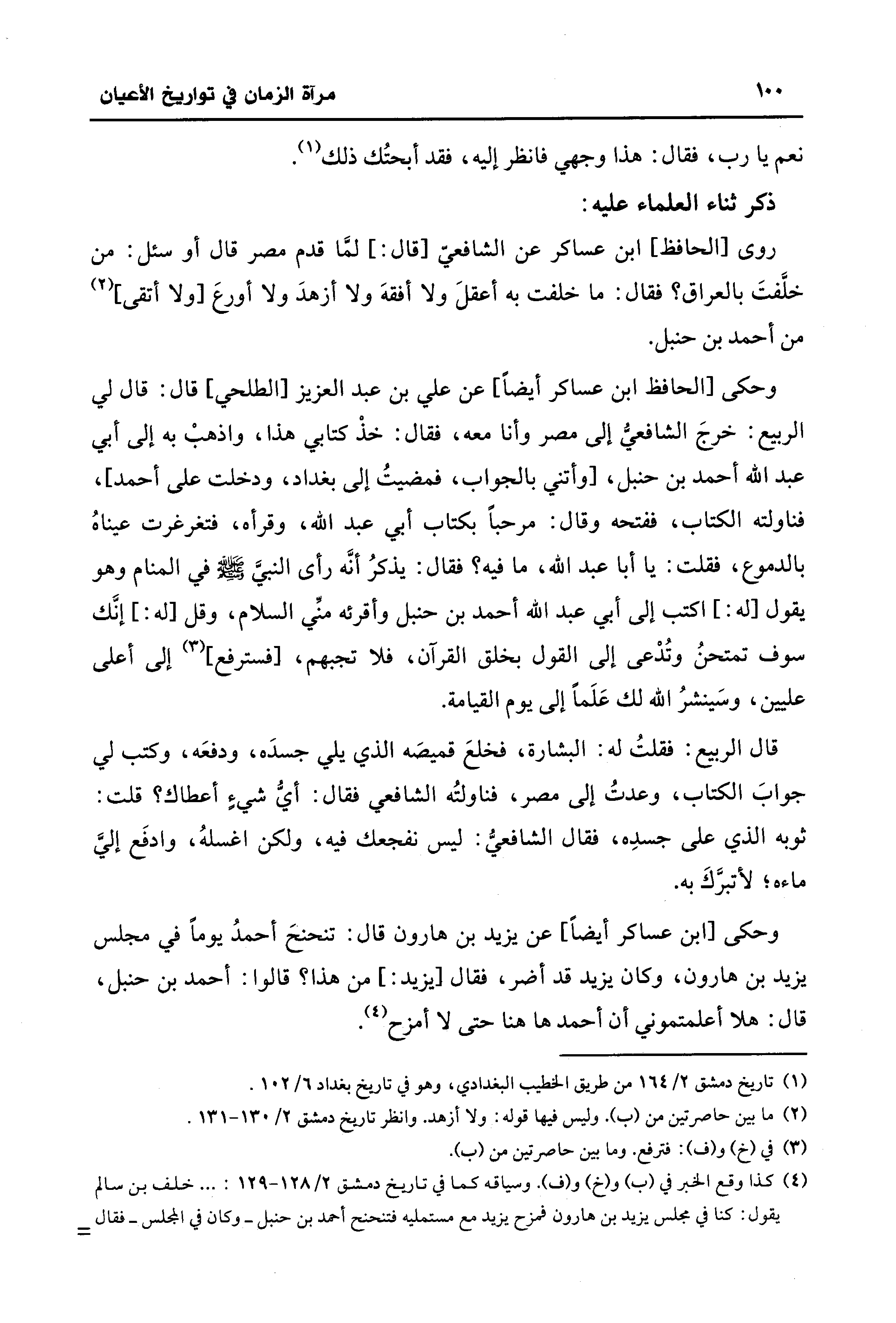 وحكى [الحافظ ابن عساكر أيضًا] عن علي بن عبد العزيز [الطلحي] قال: قال لي الربيع: خرجَ الشافعي إلى مصر وأنا معه، فقال: خذْ كتابي هذا، واذهبْ به إلى أبي عبد الله أحمد بن حنبل، [وأتني بالجواب، فمضيتُ إلى بغداد، ودخلت على أحمد]، فناولته الكتاب، ففتحه وقال: مرحبًا بكتاب أبي عبد الله، وقرأه، فتغرغرت عيناهُ بالدموع، فقلت: يا أبا عبد الله، ما فيه؟ فقال: يذكرُ أنَّه رأى النبيَّ - صلى الله عليه وسلم - في المنام وهو يقول [له: ] اكتب إلى أبي عبد الله أحمد بن حنبل وأقرئه منِّي السلام، وقل [له: ] إنَّك سوف تمتحنُ وتُدْعى إلى القول بخلق القرآن، فلا تجبهم، [فسترفع] (¬3) إلى أعلى عليين، وسَينشرُ الله لك عَلَمًا إلى يوم القيامة.